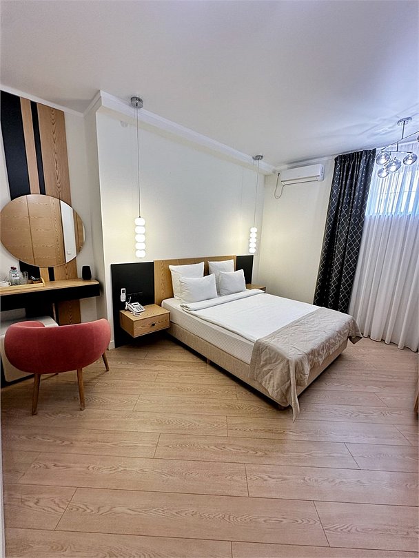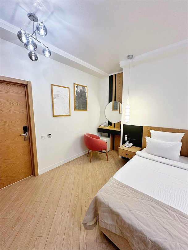 Важная информация: в номере нет телевизора, холодильника и системы умного дома. Небольшое окно. Номер может быть на 2 и 3 этаже. Уютный и современный номер на одного или двух гостей. Комплектация номера: - Двуспальная кровать - Чайник и чайный набор - Халаты для взрослых и детей, премиальная косметика для душа, тапочки, полотенца для бассейна, фен, утюг. - Самая выгодная цена за проживание В номере нет балкона.Услуги и удобства