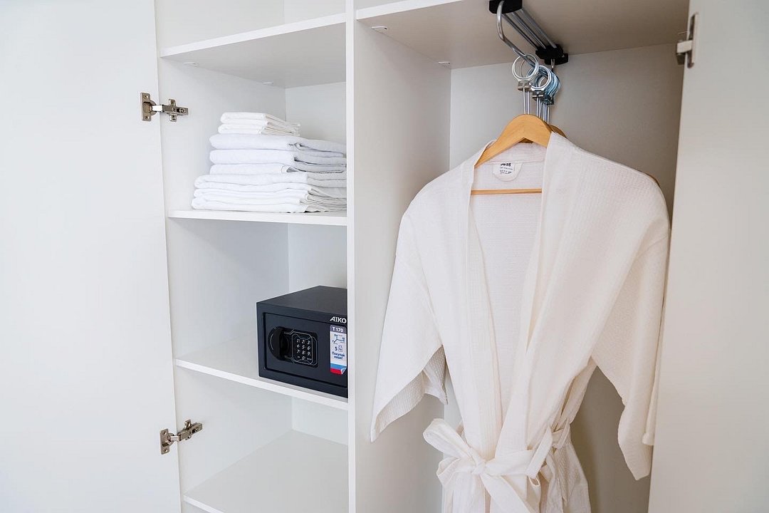 Wi-Fi, кондиционер, фен, электронные замки, утюг, халаты, пляжные полотенца, тапочки, кровать «Queen size», гладильная доска, вешалки, журнальный столик, зеркало, комод, чайный набор, сейф, чайник, душ, кресло, вид во двор, туалетный столик, туалетные средства, раскладной диван, телевизор с плоским экраном, мини-холодильник, шкаф-купе, гостиничная парфюмерия, телевизор со Smart TV, номер для некурящих, система умный дом, гигиенический душ, умная колонка, двуспальный раскладной диван-кровать, уборка номера, бутилированная водаВ номере