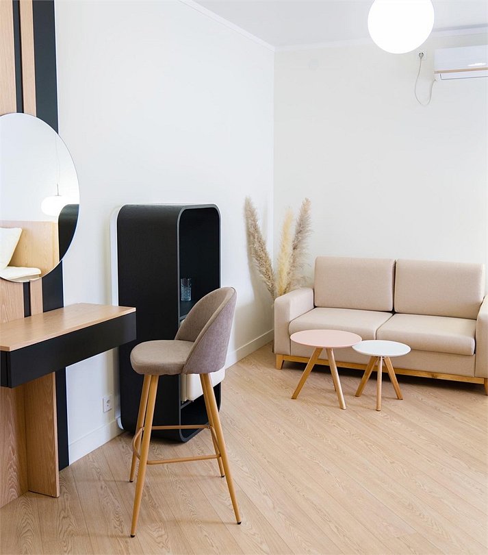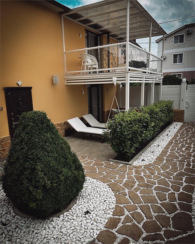 Апартаменты находятся на первом этаже со своим отдельным входом В вашем распоряжении: - Патио 12 кв.м. в красивой зеленой изгороди, со своей обеденной зоной, шезлонгами и видом на бассейн - Двуспальная кровать - Диван на одного гостя - Удобная мини-кухня с микроволновой печью, холодильником, чайником и кофемашиной - Ванная комната оснащённая тропическим душем - Халаты для взрослых и детей, премиальная косметика для душа, тапочки, полотенца для бассейна, фен, утюг. - Умная колонка - Апартаментами можно управлять при помощи системы «Умный дом».Услуги и удобства