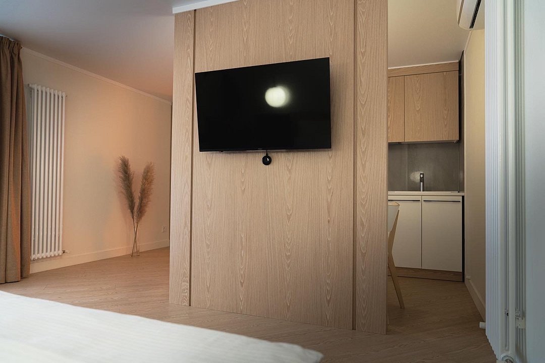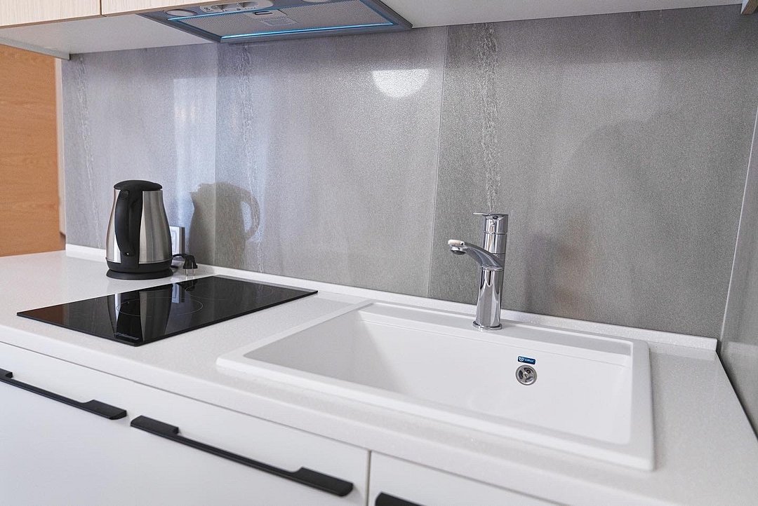 Wi-Fi, холодильник, кондиционер, фен, плита для приготовления пищи, кофемашина, микроволновая печь, утюг, халаты, пляжные полотенца, тапочки, кровать «Queen size», тумбы, стулья, шкаф для одежды, вешалки, обеденный стол, зеркало, кухня, чайный набор, сейф, чайник, раковина, отдельный вход в номер, душ, кухонная посуда, кухонная утварь, столовые приборы, туалетный столик, туалетные средства, сушилка для белья, диван-кровать, гостиничная парфюмерия, телевизор со Smart TV, система умный дом, гигиенический душ, умная колонка, бутилированная вода, частный дворВ аппартаментах