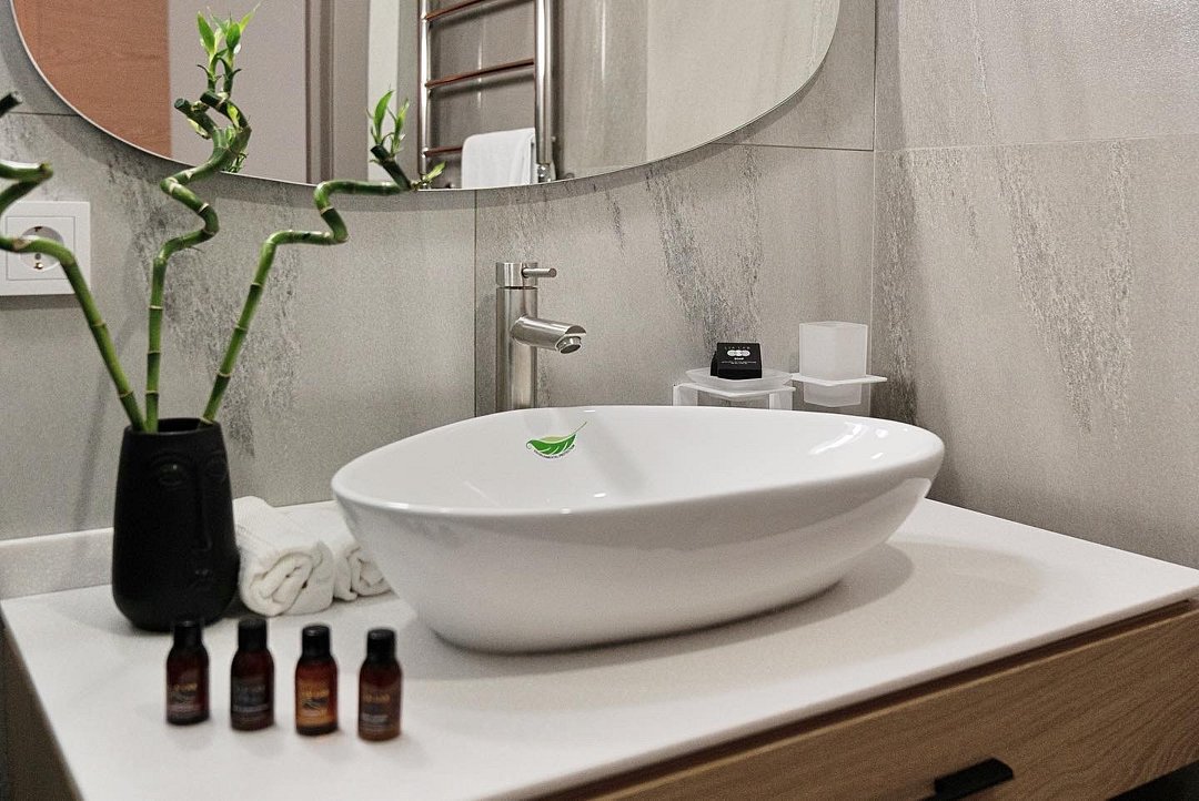 Роскошный и просторный номер с уникальным дизайном для особенно требовательных гостей. - Уютная спальня с кроватью queen-size - Просторная спальня-гостиная с панорамными окнами, из которой вы попадаете на роскошную террасу в 21 кв.м. - Ванная комната оснащена всем необходимым для вашего комфорта: халаты для взрослых и детей, премиальная косметика для душа, тапочки, полотенца для бассейна, фен, утюг. - Умная колонка, 2 телевизора, чайник. - Номером можно управлять при помощи системы «Умный дом».Услуги и удобства