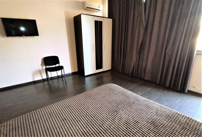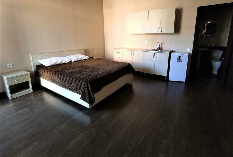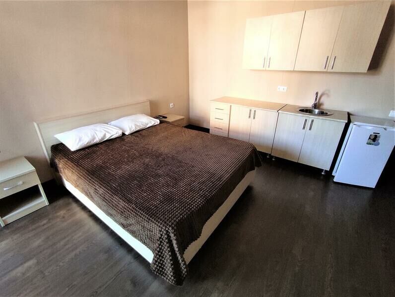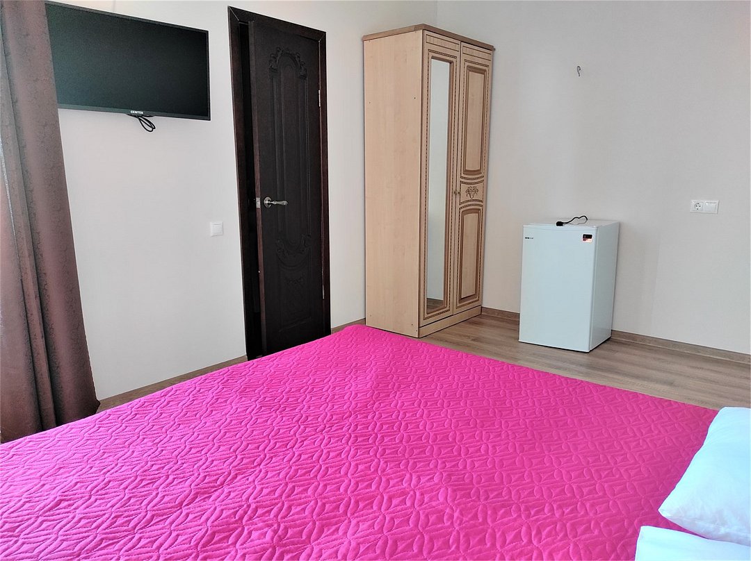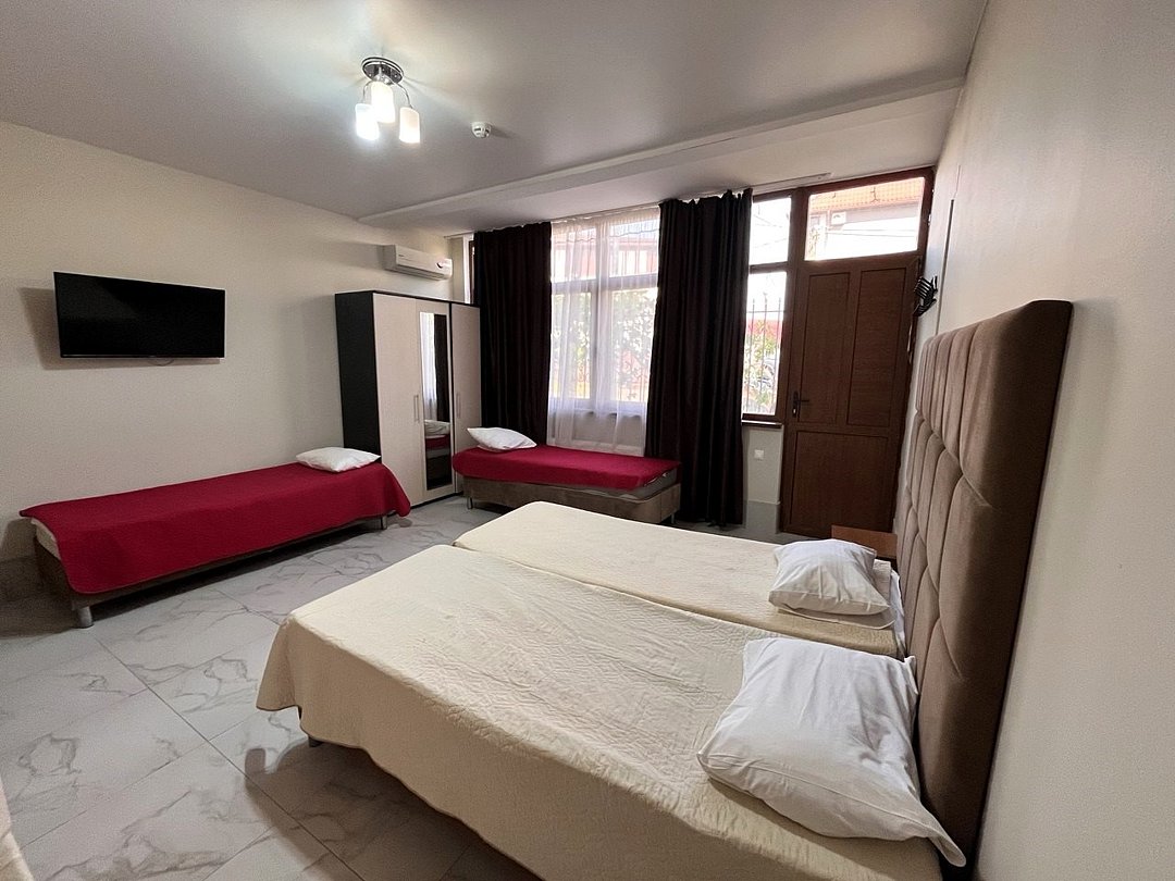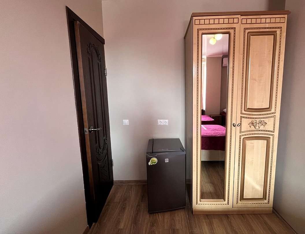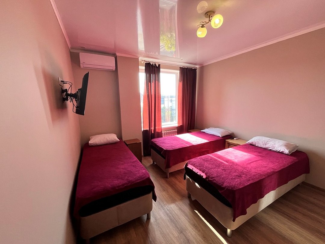 Этаж 1 или 2. Площадь номера: 22-24 кв.м. Количество основных мест: 3. Количество дополнительных мест: 1 (раскладная кровать) В номере: санузел (душ, туалет, умывальник, фен, тапочки, туалетные принадлежности), ТВ, мини-кухня (холодильник, микроволновка, мойка, чайник, посуда), кондиционер, двуспальная и односпальная или три односпальные кровати, шкаф для одежды, тумбы, стол, стулья.Услуги и удобства