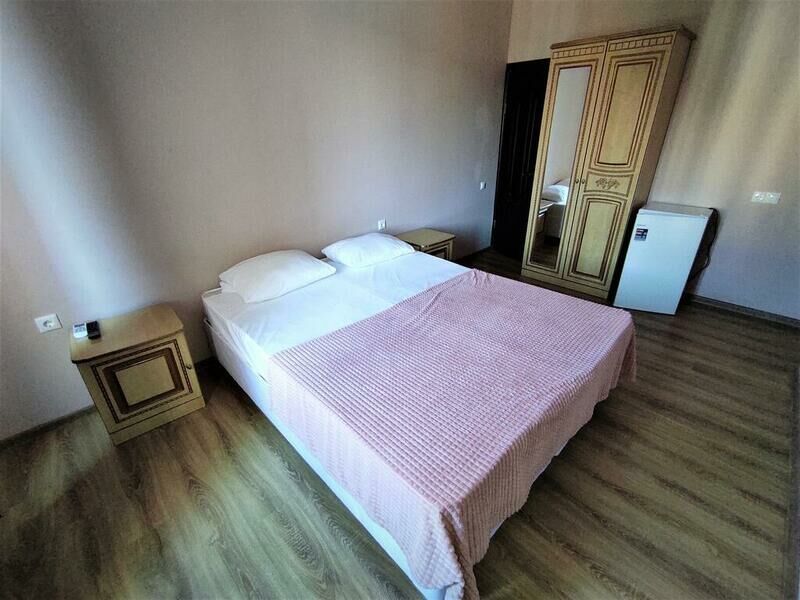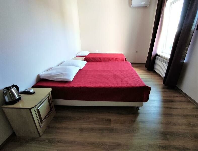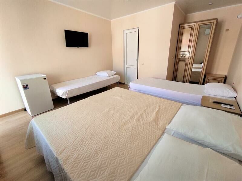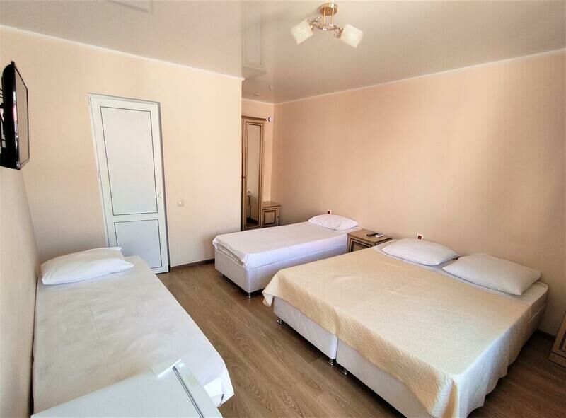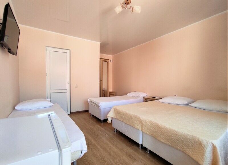 Этаж 1 или 2. Площадь номера: 22-24 кв.м. Количество основных мест: 3. Количество дополнительных мест: 1 (раскладная кровать) В номере: санузел (душ, туалет, умывальник, фен, тапочки, туалетные принадлежности), ТВ, холодильник, кондиционер, двуспальная и односпальная или три односпальные кровати, шкаф для одежды, тумбы, стол, стулья.Услуги и удобства