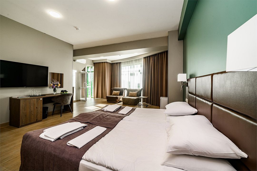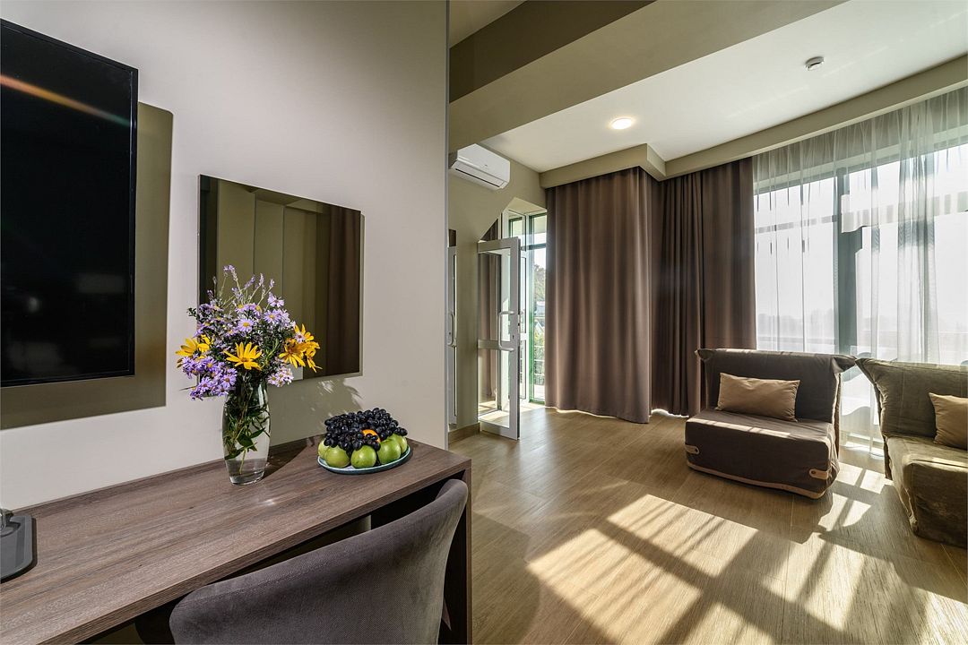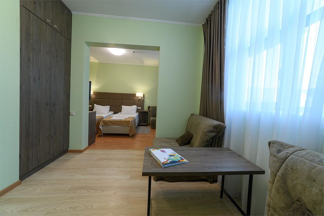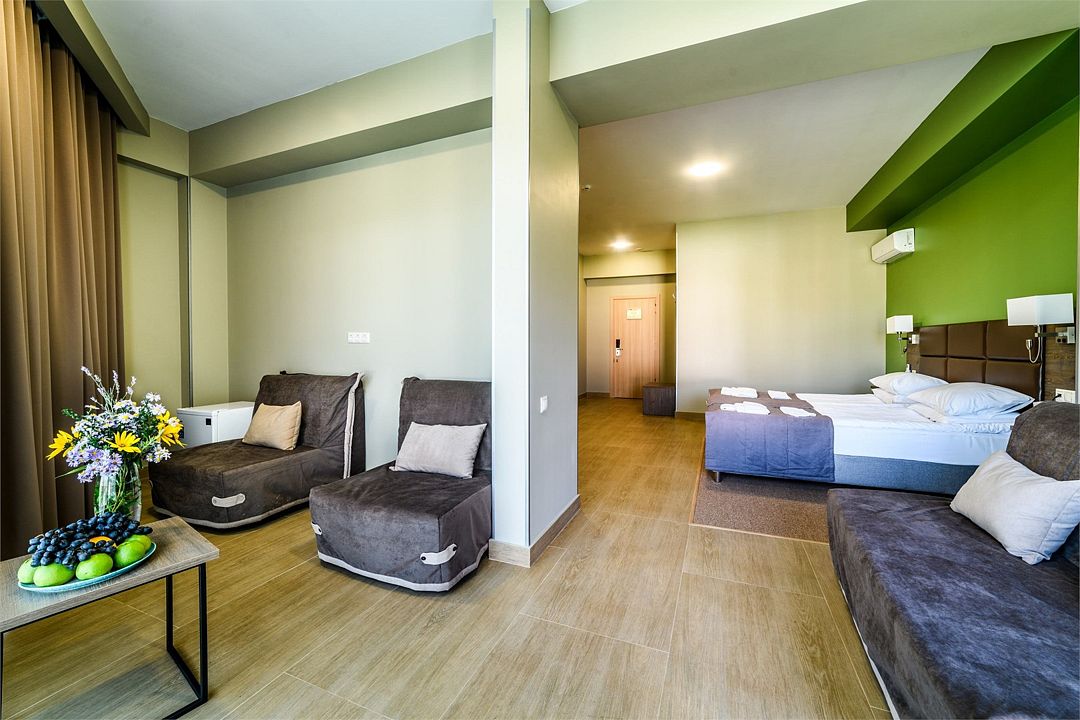 Большой двухкомнатный номер с панорамными окнами подходит для размещения двоих гостей или семьи из трех-пяти человек.