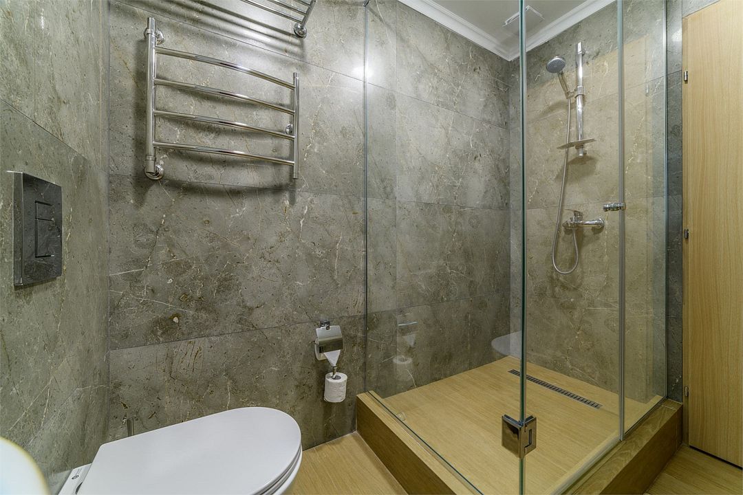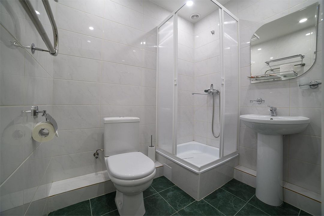 Санузел оснащен душевой кабиной, умывальником, унитазом, зеркалом с подсветкой, феном.