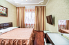 Три раздельные кровати / двуспальная кровать+диван, тумбочки прикроватные, шкаф, туалетный столик, стул, холодильник, кондиционер, телевизор, чайник, санузел (душ+туалет), туалетные принадлежности