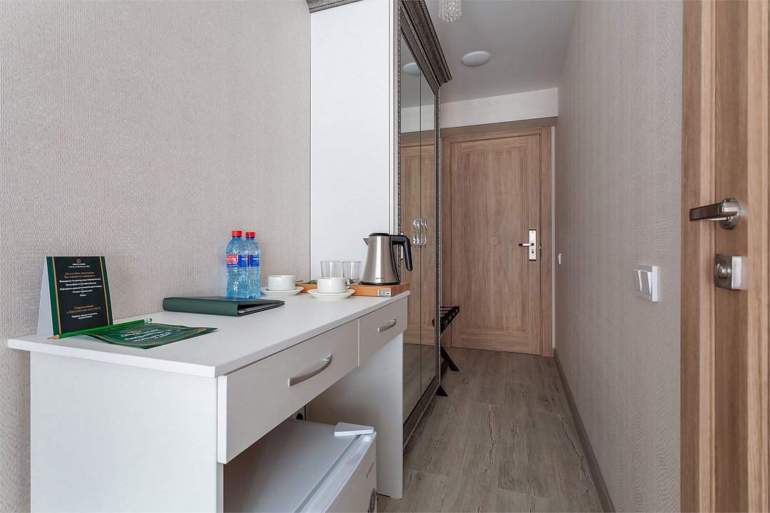 телевизор, Wi-Fi, фен, ванная комната, санузел, банные полотенца, пляжные полотенца, тапочки, гигиенические средства, односпальная кровать, шкаф для одежды, вешалки, зеркало, обслуживание номеров, сейф, чайник, раковина, душ, кулер на этаже, стаканы, тумба, туалетные средства, сплит-система, внутренний телефон, мини-холодильник, рабочий стол, уборка номера, набор для приготовления чая и кофе, мылоВ гостиничном номере
