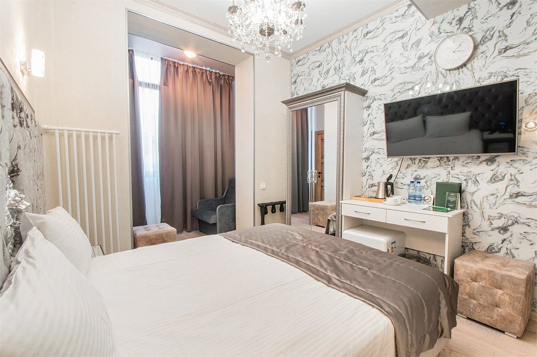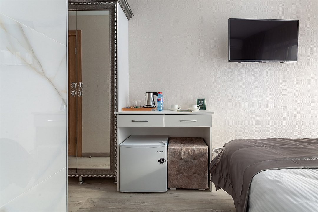 телевизор, Wi-Fi, фен, ванная комната, санузел, банные полотенца, пляжные полотенца, тапочки, гигиенические средства, балкон, две односпальные или большая двуспальная кровать, шкаф для одежды, вешалки, зеркало, эксклюзивная мебель, обслуживание номеров, сейф, чайник, раковина, душ, кулер на этаже, стаканы, тумба, туалетные средства, сплит-система, раскладное кресло, внутренний телефон, мини-холодильник, рабочий стол, кресло-кровать, уборка номера, набор для приготовления чая и кофе, мылоВ гостиничном номере