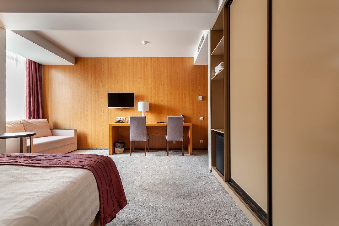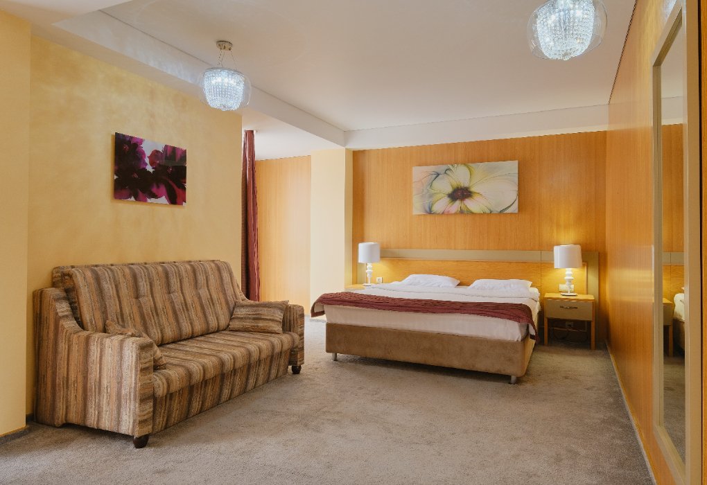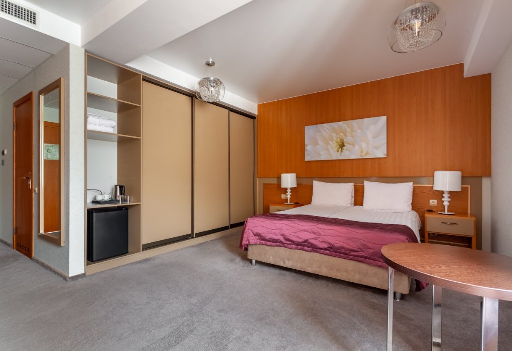 Комфортный однокомнатный номер с двуспальной кроватью и одноместным раскладным диваном.