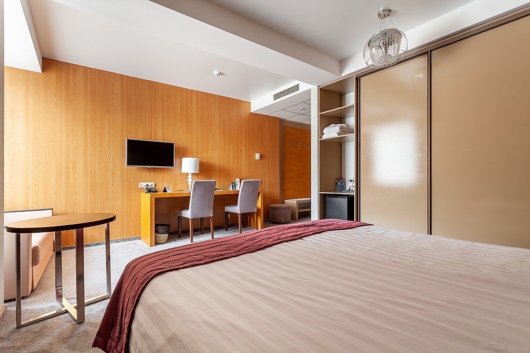 Просторный однокомнатный номер с большой двуспальной кроватью и двухместным раскладным диваном.