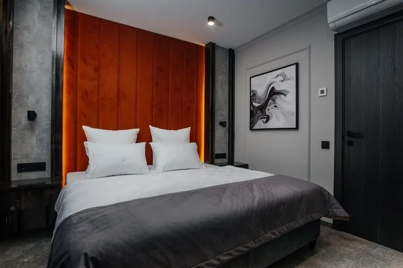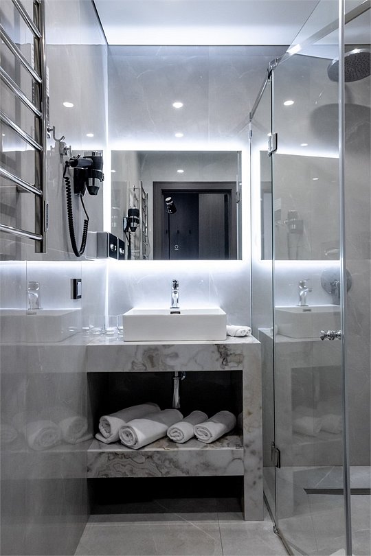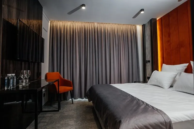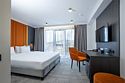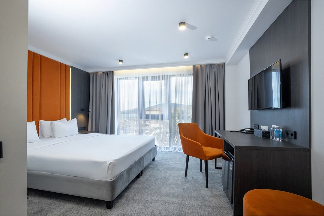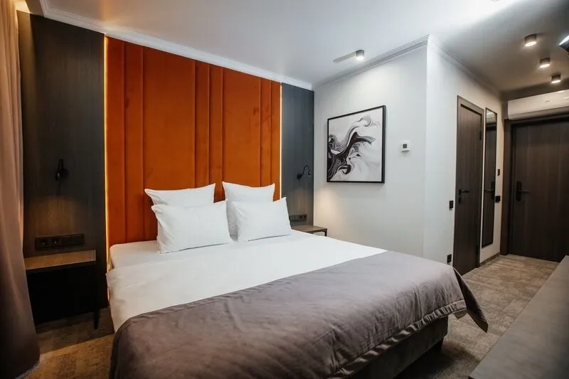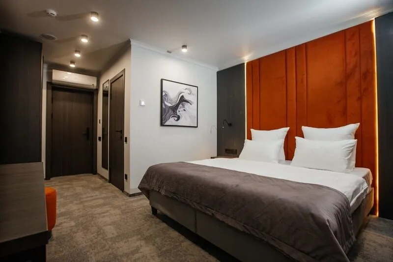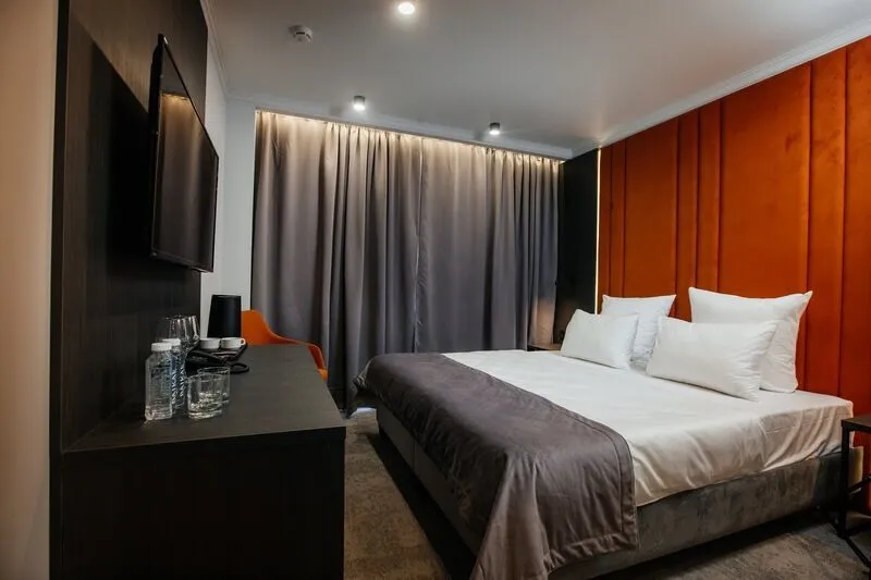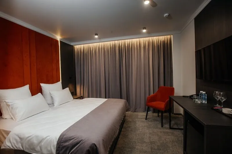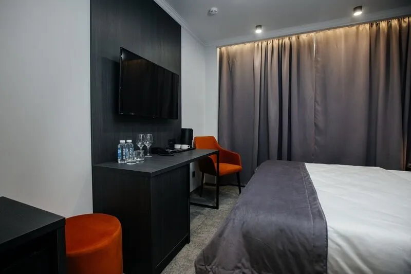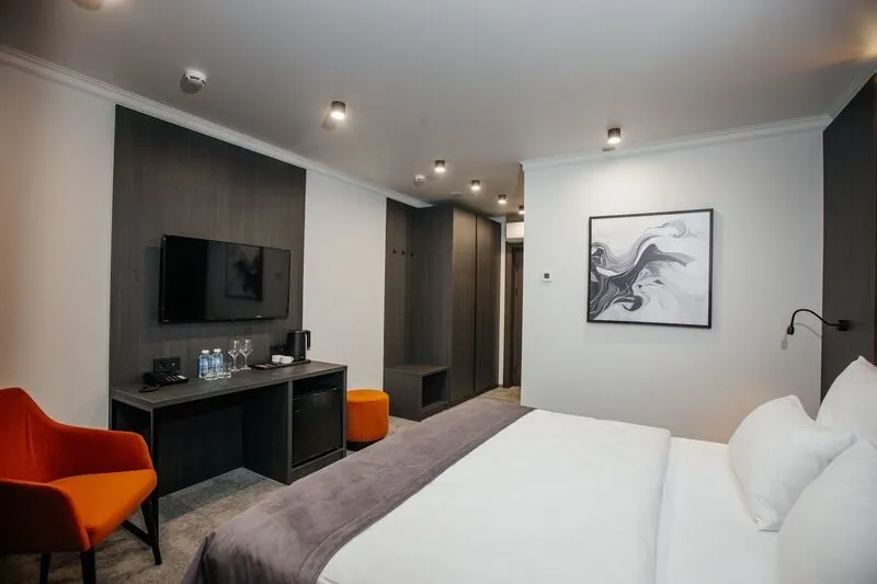 Отдохните в нашем уютном однокомнатном номере, идеально подходящем для двоих! Вас ждет комфортабельная двуспальная кровать, письменный стол, телевизор для приятного отдыха и мини-бар. В просторной прихожей – зеркало в полный рост и вместительный шкаф для гардероба. Санузел оборудован всем необходимым: душевая, полотенцесушитель, зеркало с подсветкой и гигиенический душ. Чайная станция, мини-бар и сейф для ценностей добавят удобства вашему пребыванию.Услуги и удобства