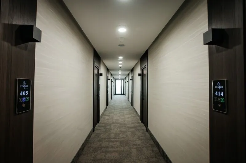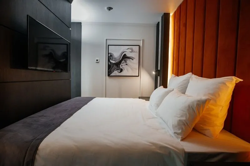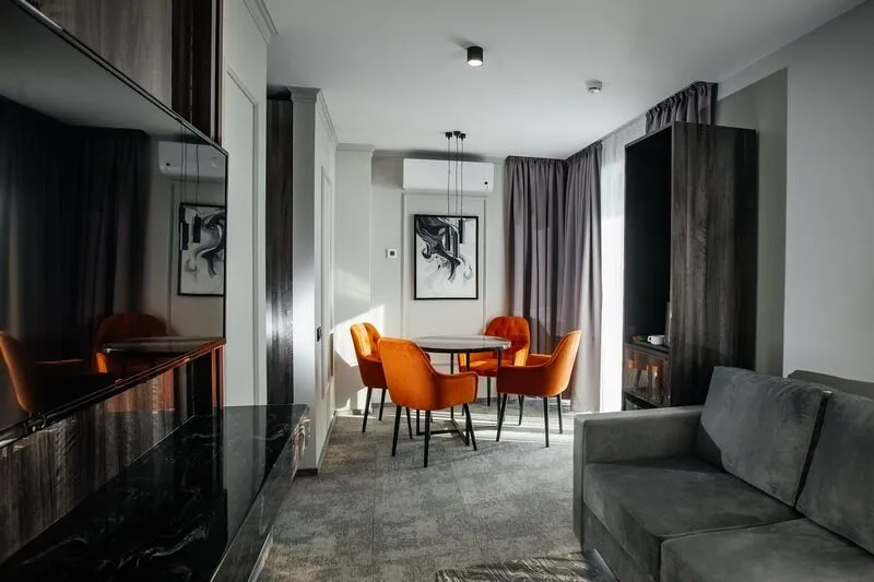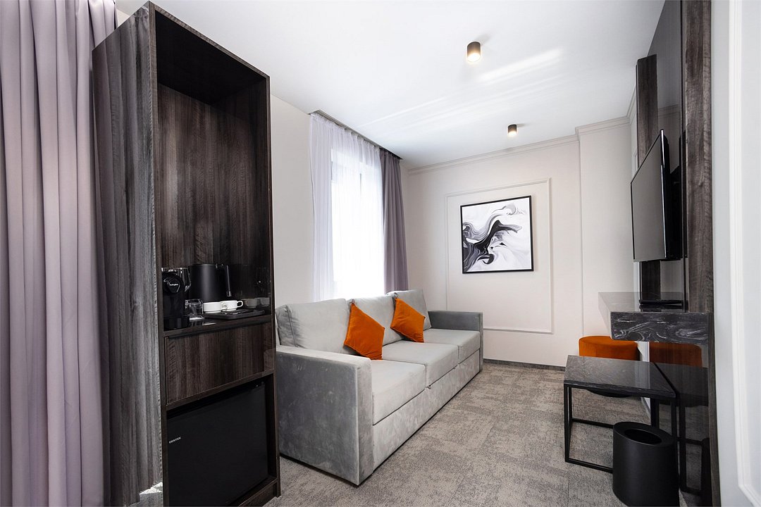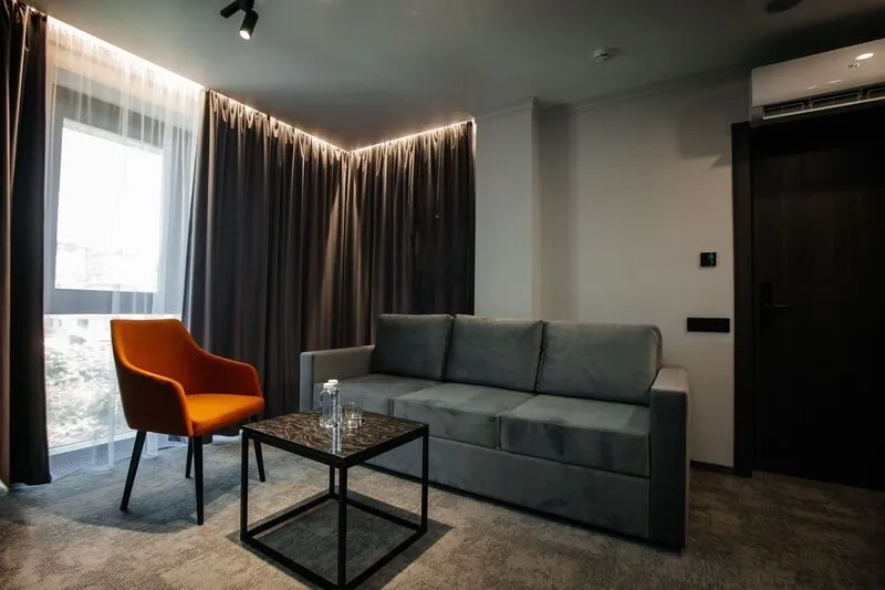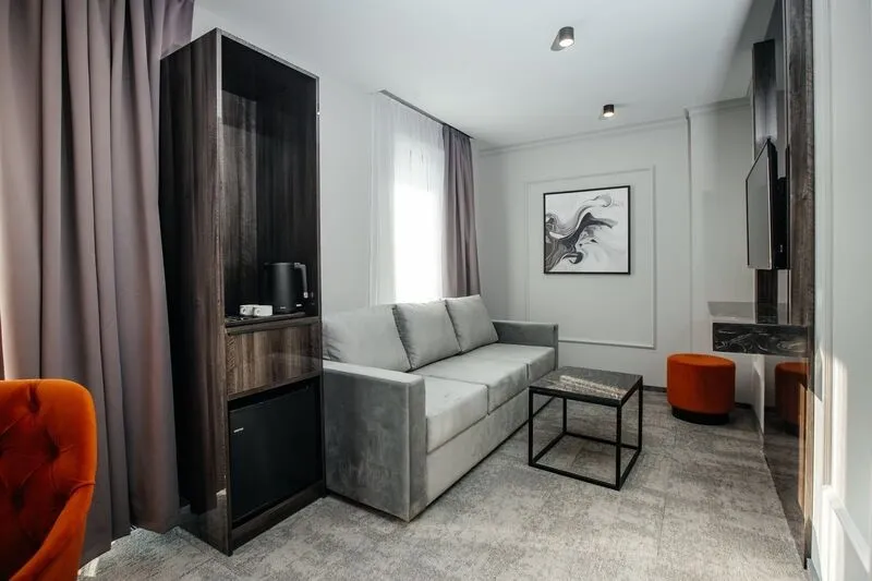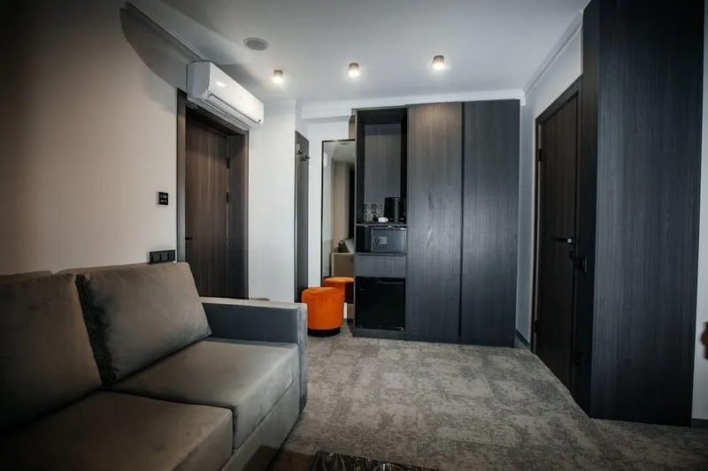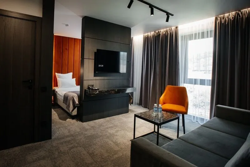 Наш просторный однокомнатный номер с зонированием – идеальный выбор для семей или небольших компаний. Перегородка элегантно разделяет пространство на спальную и гостиную зоны. В номере: двуспальная кровать и удобный двухместный раскладной диван, а также два телевизора для комфортного просмотра. К вашим услугам журнальный столик и письменная стойка под телевизором. Чайная станция и мини-бар добавят уюта. В прихожей – зеркало в полный рост и вместительный шкаф. Современный санузел оборудован душевой кабиной, полотенцесушителем, гигиеническим душем и зеркалом с подсветкой.Услуги и удобства