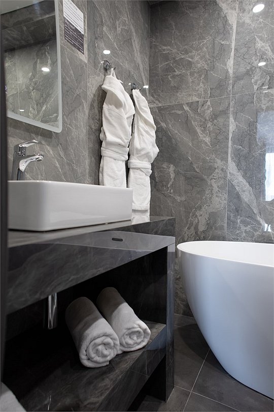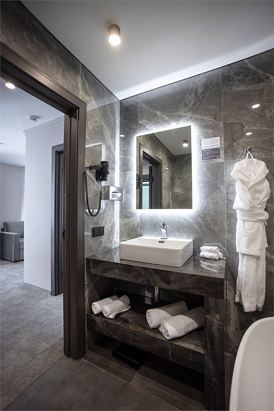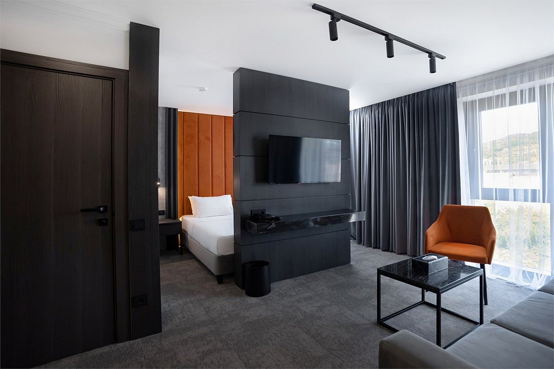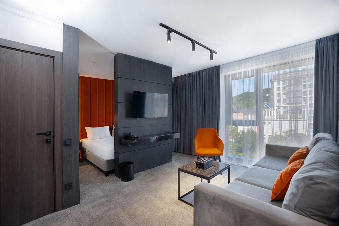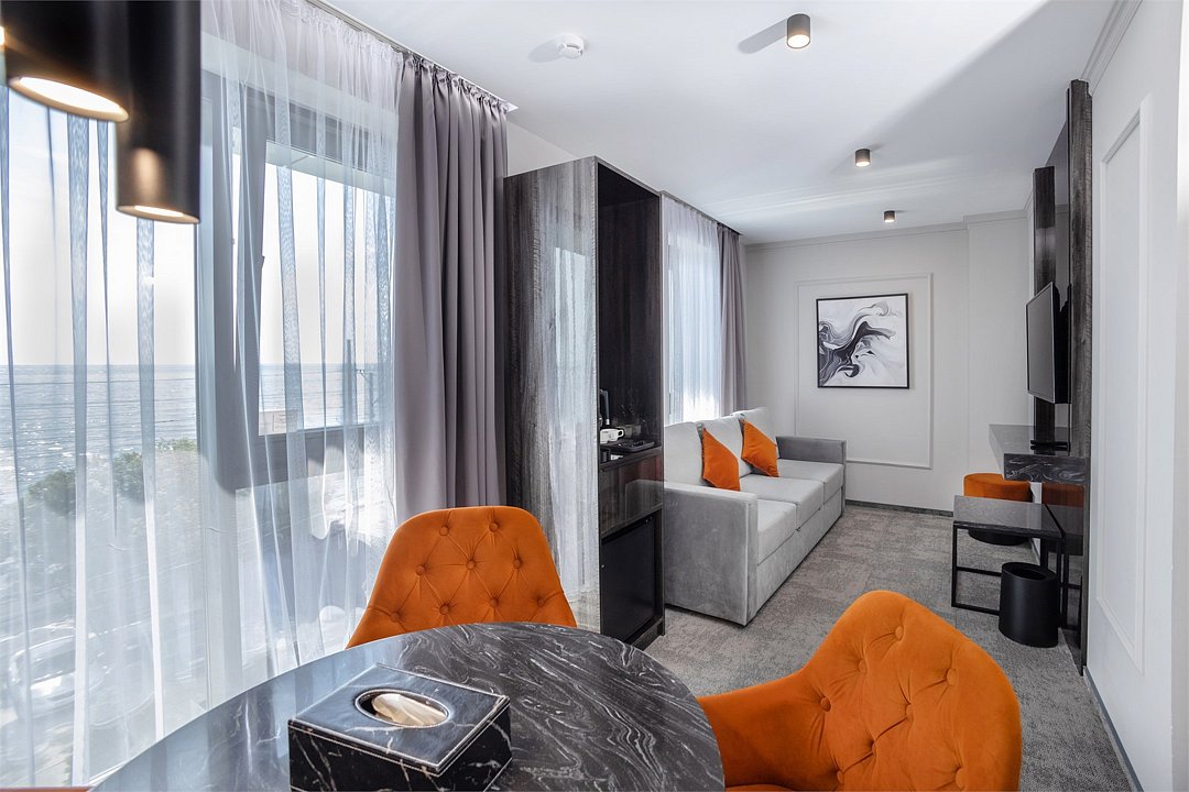 Просторный двухкомнатный номер с двуспальной кроватью 160*200 и диваном 160*200 В гостиной установлена сплит-система, телевизор и журнальный стол. Номер оборудован чайной станцией, кофемашиной и мини-баром, а также обеденным столом на 4 персоны. В спальне есть телевизор и письменный стол. Санузел включает ванну, гигиенический душ и полотенцесушитель, а также зеркало с подсветкой. В прихожей размещено зеркало в полный рост и большой шкаф для одежды. Из окна открывается вид на море.Услуги и удобства