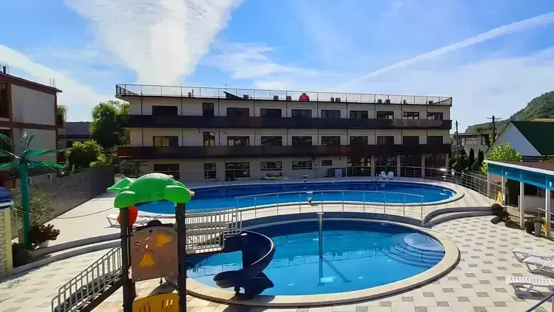 Отель имеет большую ухоженную огороженную территорию. На ней размещается 3-этажный жилой корпус с просторным холлом, комфортабельными номерами и рестораном, детская игровая площадка, зона отдыха с беседками и лавочками, бар, зона барбекю, 2 бассейна, оборудованных шезлонгами и теневыми зонтами (в одном из бассейнов оборудованы детские горки).