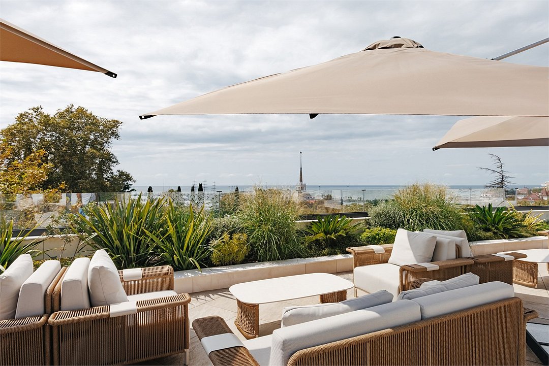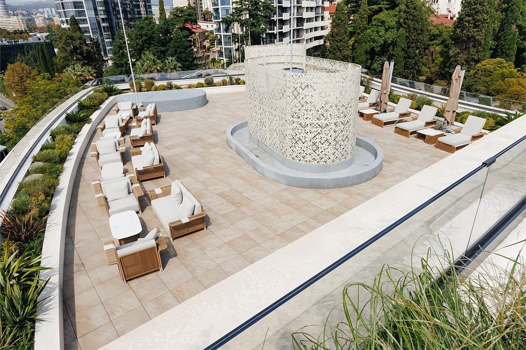 - пользование солнечной палубы (каскад из трех уровней эксплуатируемой кровли, оснащенных комфортной мебелью, солнцезащитными зонтами, элементами ландшафтного дизайна и прекрасными видами).
