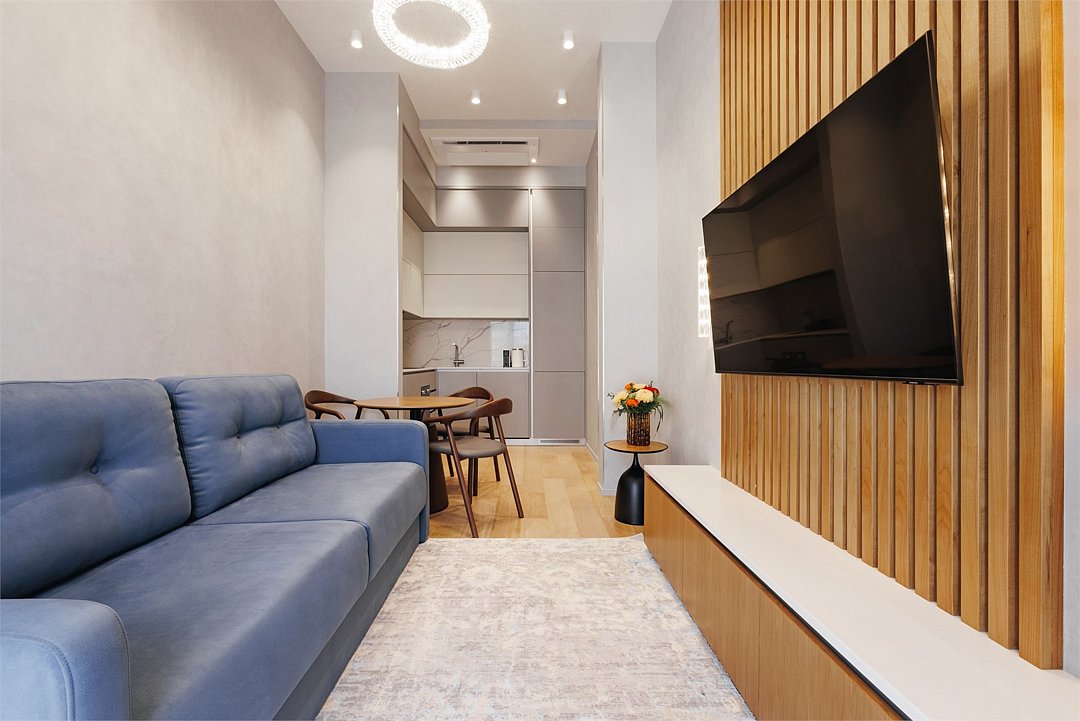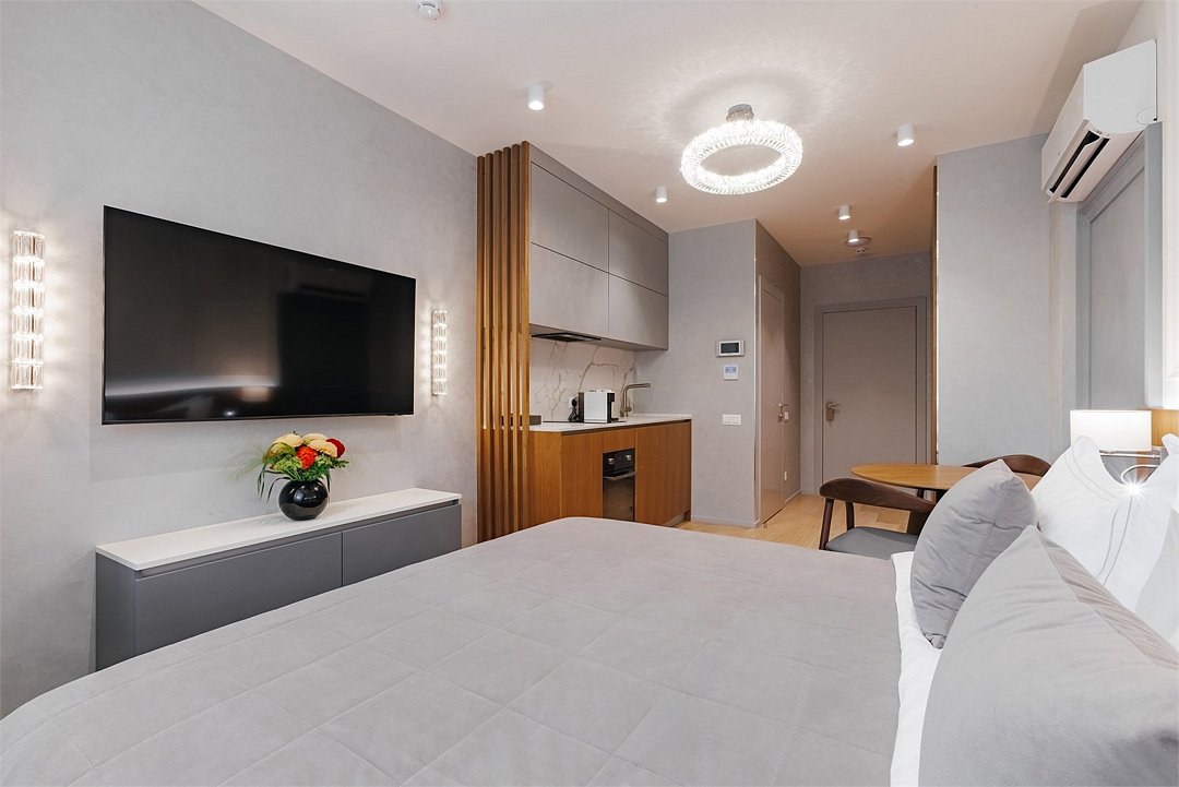 оборудованная мини-кухня, диван, кровать «king size»