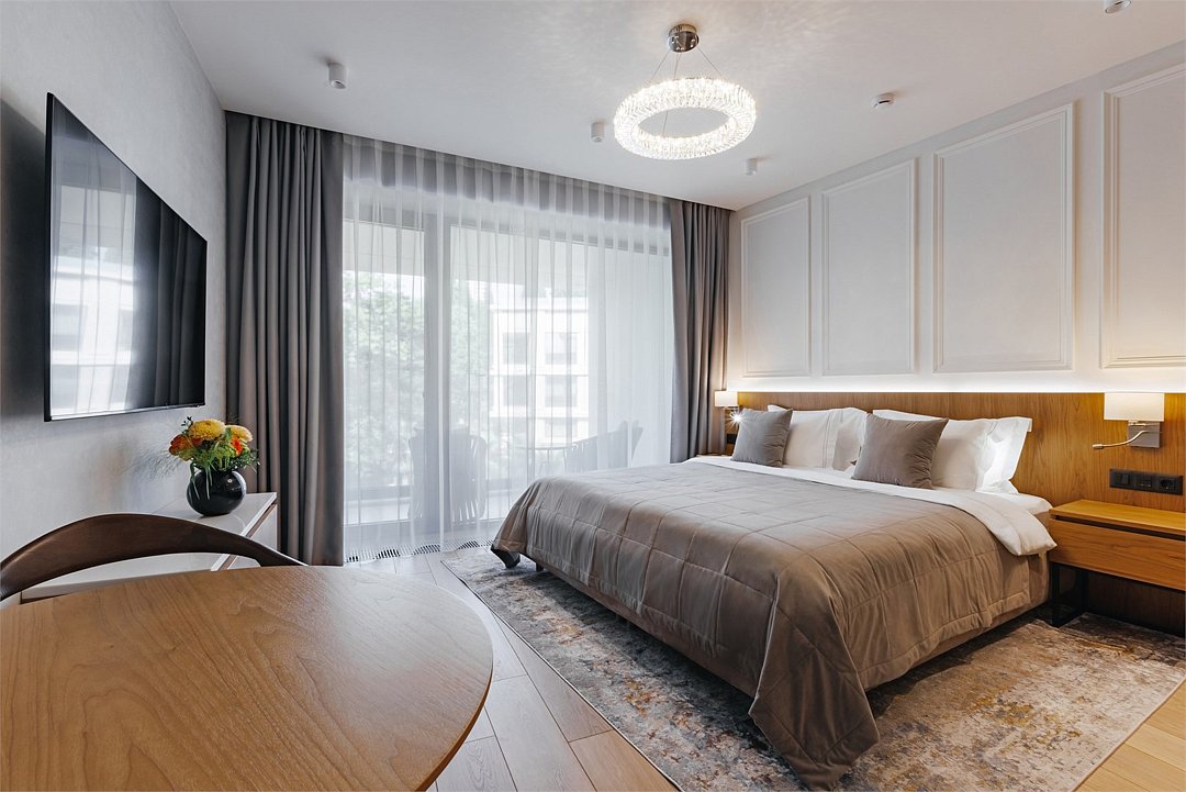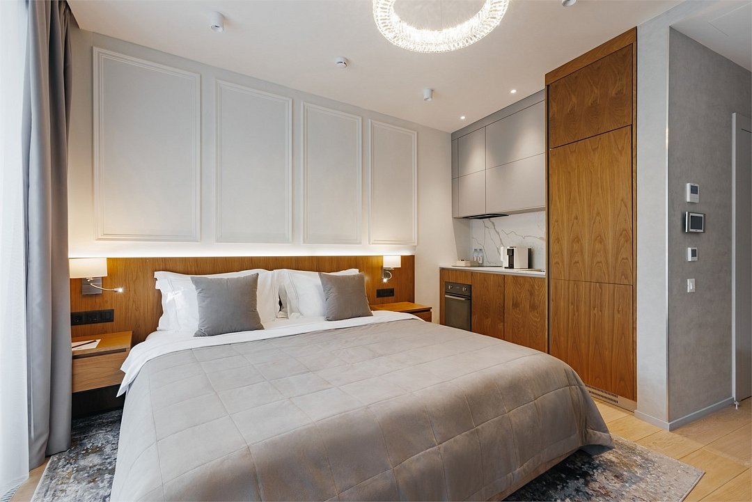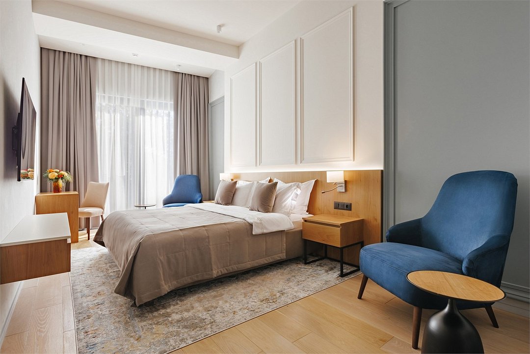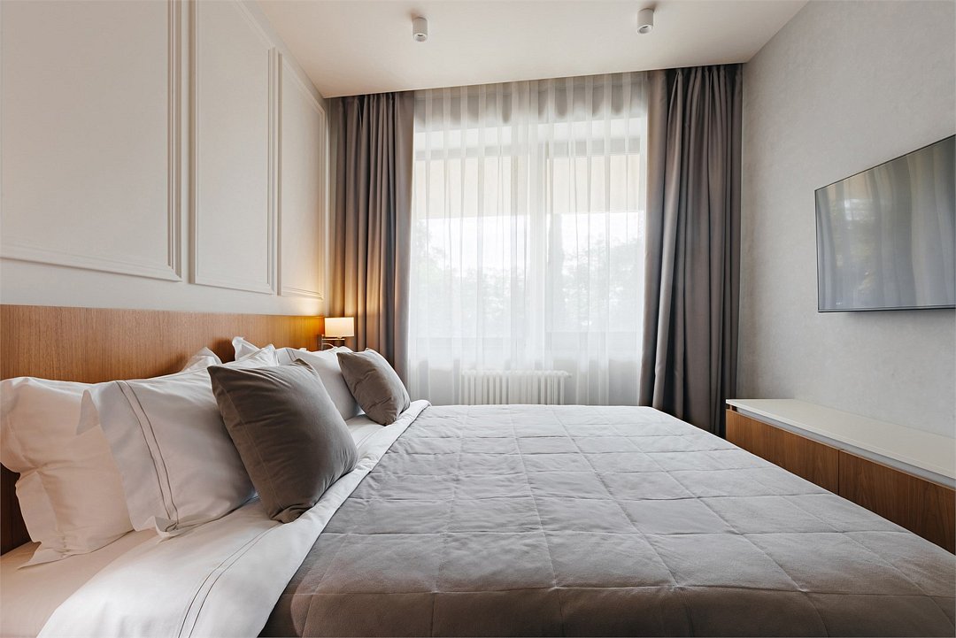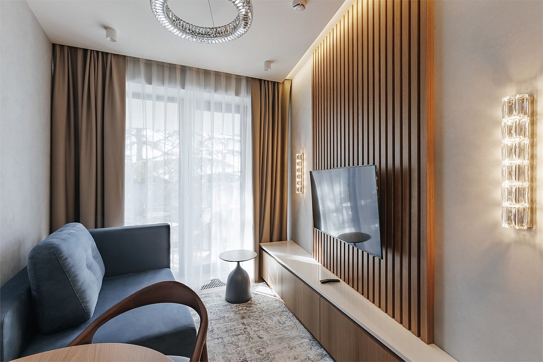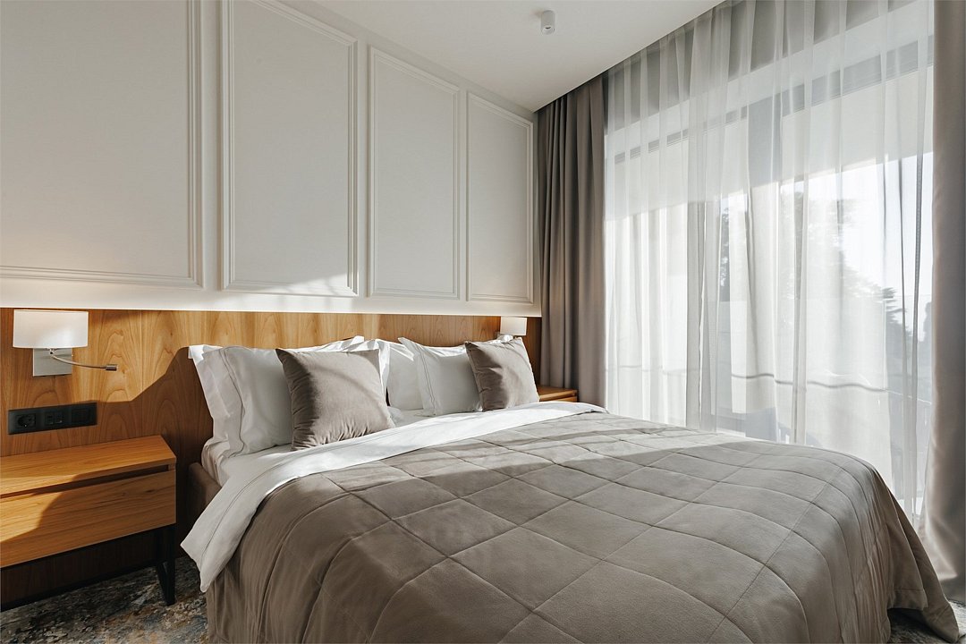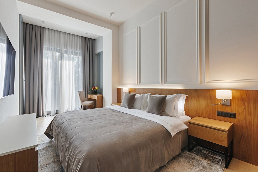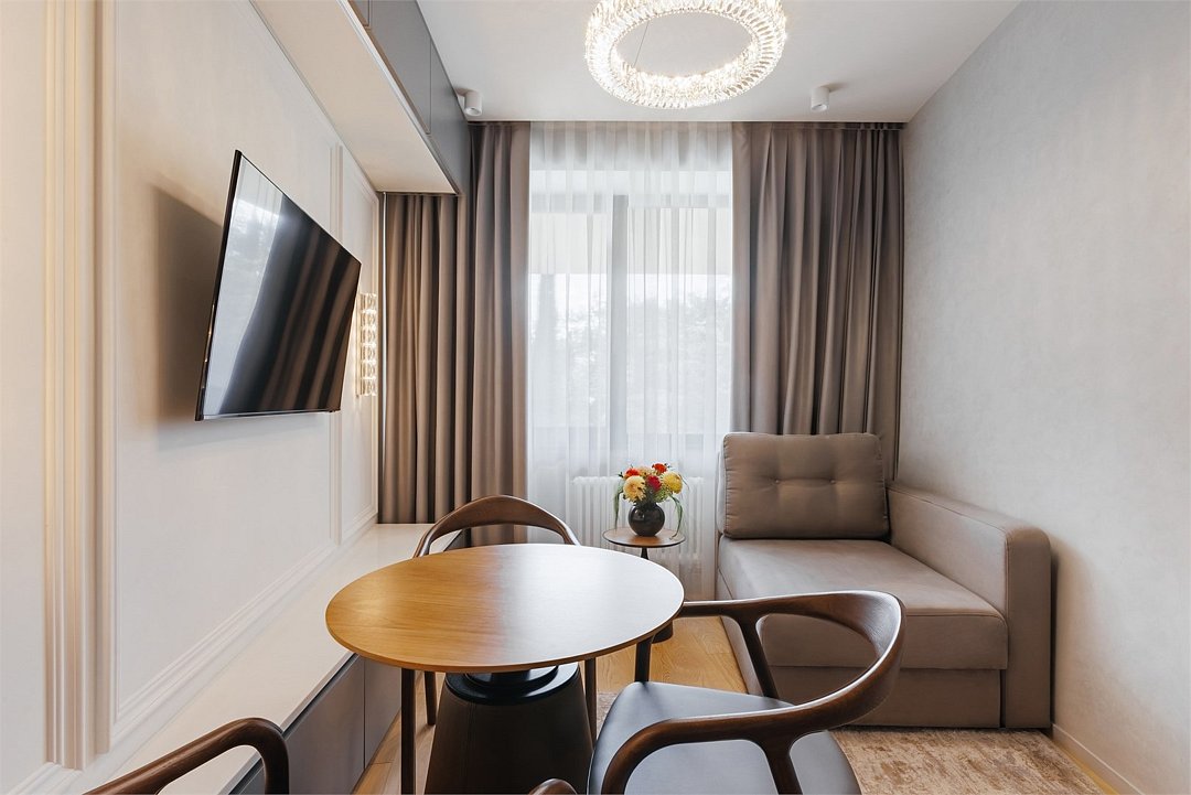 Номер категории Представительский люкс подарит вам возможность не только максимально комфортно разместиться всей семьей, но и наслаждаться простором номеров. Комплектация каждого номера в данной категории состоит из двух спален, кухни-гостиной, ванной комнаты. Идеальный вариант для длительного комфортного отдыха или проживания. В номерах данной категории имеется раскладной диван с размером спального места 1*1,9 м. В Представительском люксе можно разместить до 5 гостей. Один ребёнок до 3 лет включительно — может разместиться без дополнительного спального места. По запросу предоставляется детская кроватка. Каждый из дизайнерских номеров выполнен в индивидуальном стиле и может отличаться от предоставляемых фотографий.Услуги и удобства