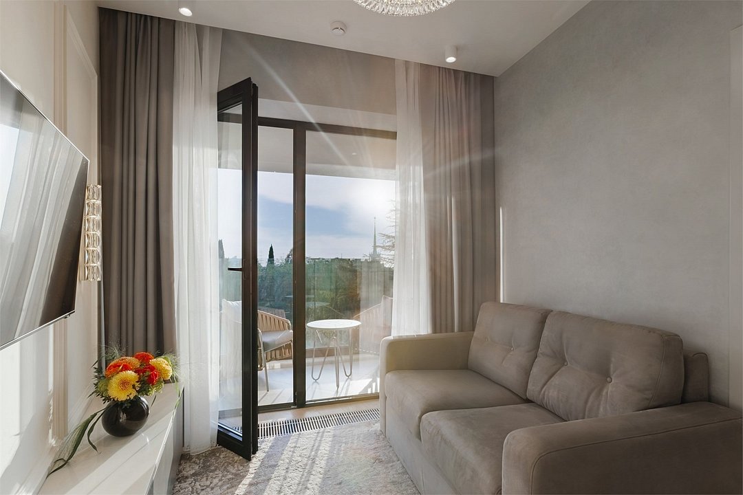 Максимальный комфорт и лучшие впечатления от проживания – основные характеристики номеров категории Гранд люкс с видом на море. В номерах к услугам гостей просторные кухни-гостиные, спальня с кроватью 1,8*2 м, балкон и потрясающий вид на здание Морского вокзала и черное море, а вместе с ними и знаменитые сочинские закаты и неповторимые краски утреннего неба. Номер предусмотрен для размещения 2 взрослых и 1 ребенка до 12 лет включительно. Один ребёнок до 3 лет включительно — может разместиться без дополнительного спального места. По запросу предоставляется детская кроватка. Каждый из дизайнерских номеров выполнен в индивидуальном стиле и может отличаться от предоставляемых фотографий.Услуги и удобства