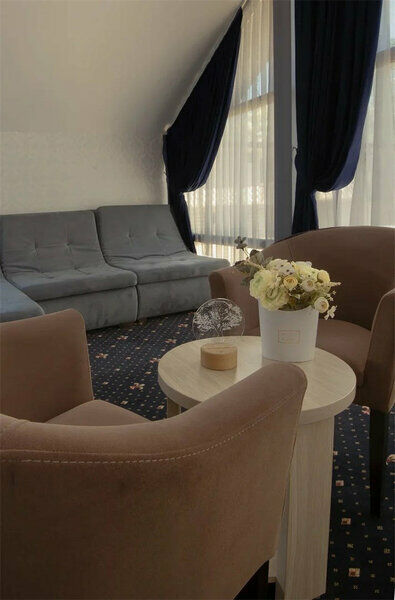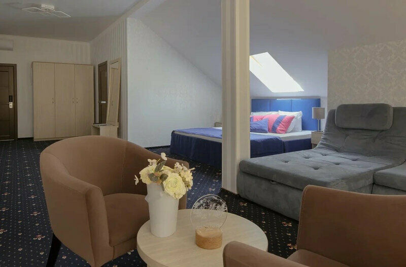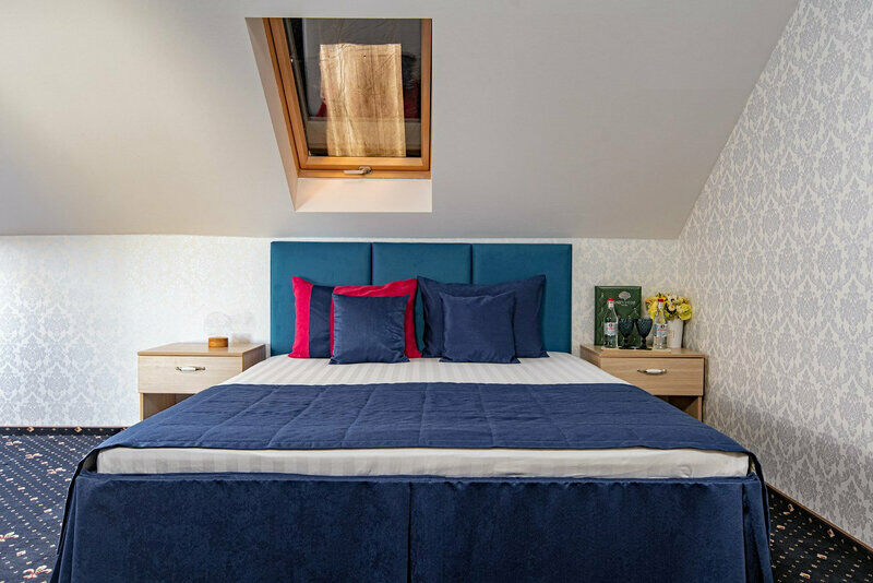 Эксклюзивный дизайн и насыщенные яркие тона отделки номера создают неповторимую атмосферу сочетания стиля и комфорта. Просторный номер площадью 44 кв.м, расположенный на четвертом этаже с потрясающим видом на лес сделает Ваше прибывания в нашем отеле приятным. В каждом номере: большая кровать "King size" (180х200) с ортопедическим матрасом. Гипоаллергенные подушки, натуральное постельное белье из 100% хлопка. Ванная комната с душевой кабиной, рабочее место(стол), сейф, звуконепроницаемые окна, телевизор с плоским экраном, сплит-система, мини-холодильник, приборы для приготовления чая или кофе. К услугам гостей служба Room Service 24 часа. Без балкона. Гостям на время пребывания предлагаются косметические средства высокого качества. Бутилированная вода при заезде, а также, халат и тапочки. Ванная комната оснащена душевой кабиной, феном, косметическим зеркалом и весами. завтраки включены в стоимость номера.