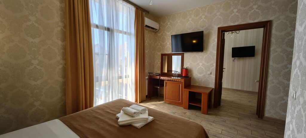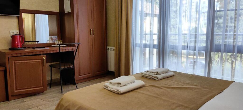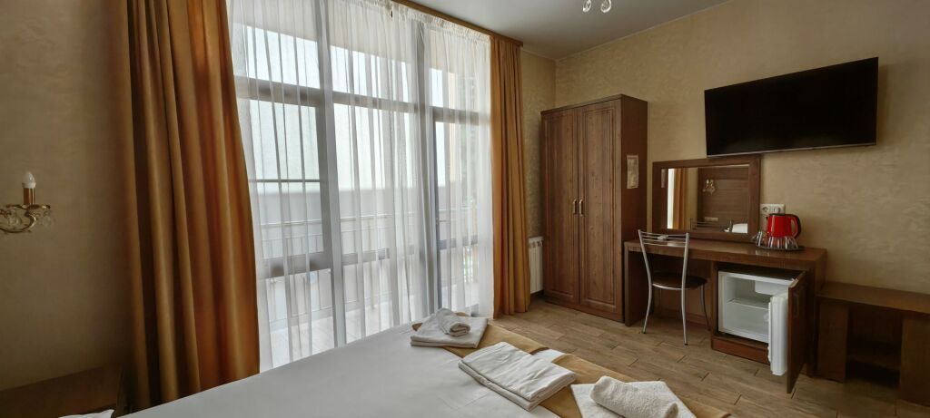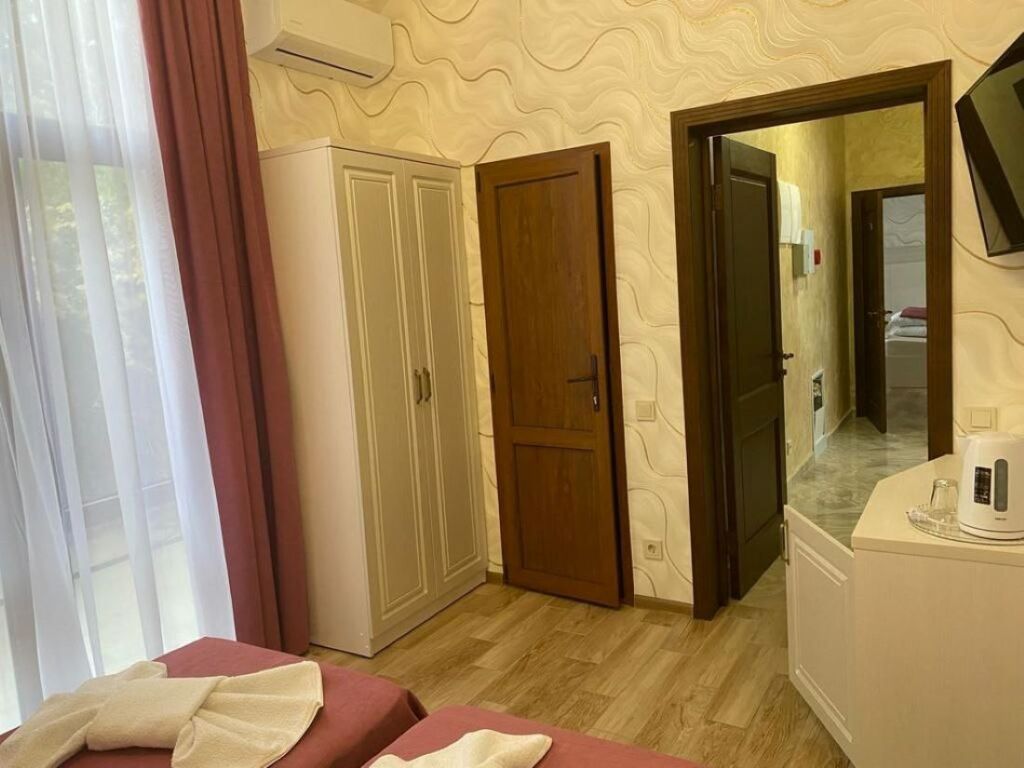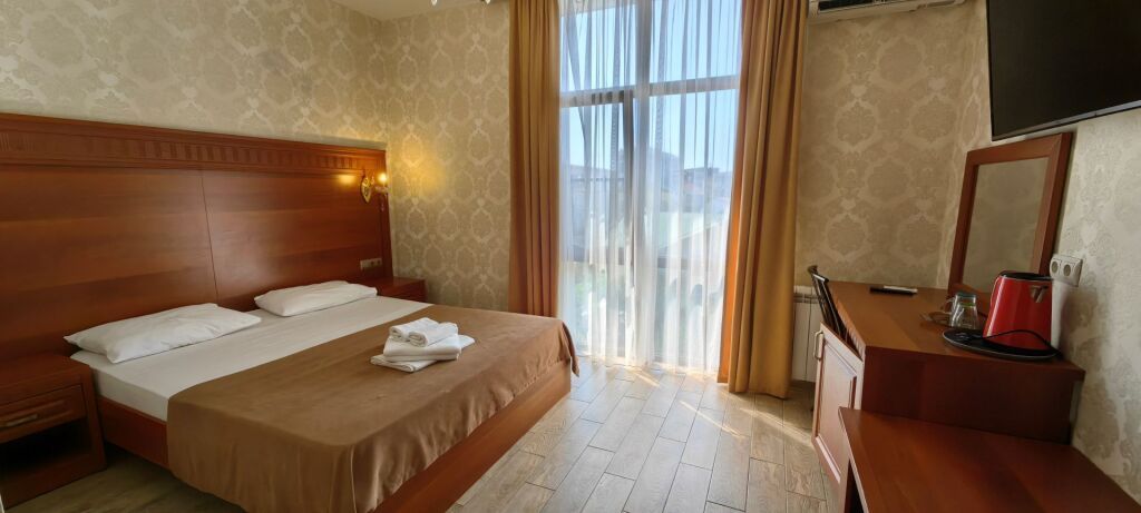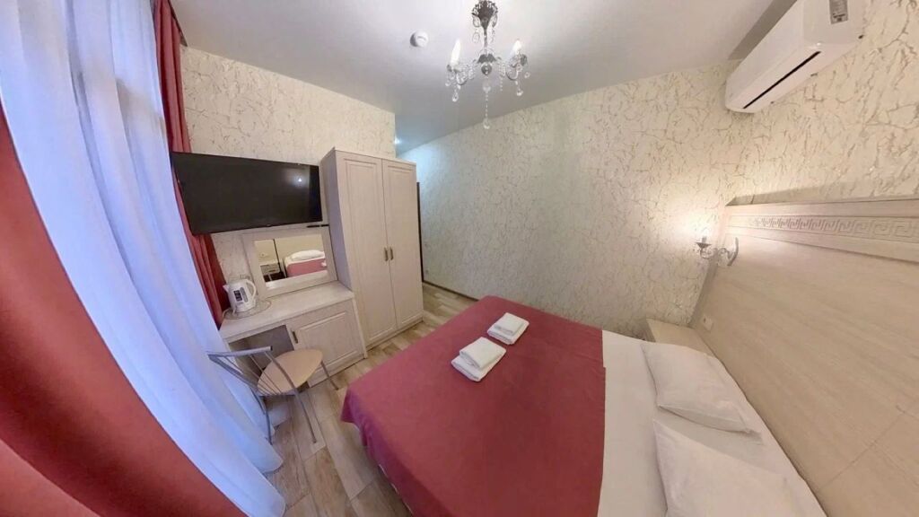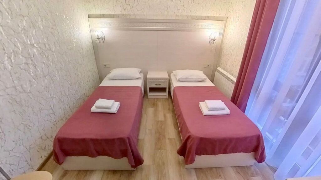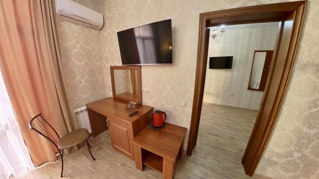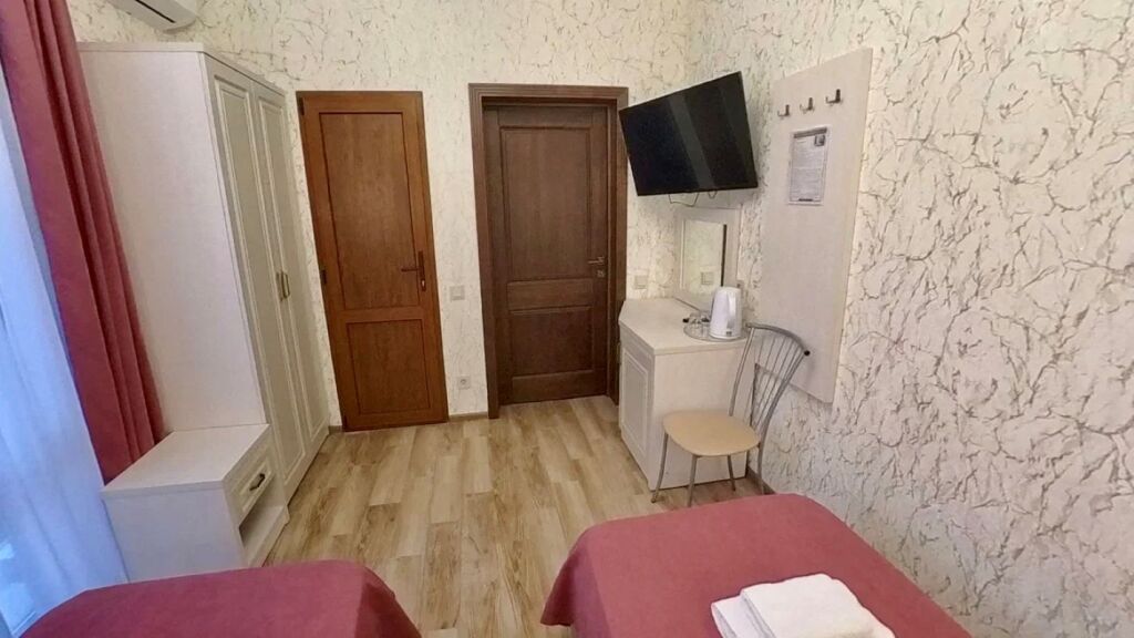 Комната предназначена для проживания двух человек. Комната выполнена в современном стиле и спокойных цветовых тонах, оборудована всем необходимым: чайник, чайная пара, холодильник, кондиционер, что позволяет гостям чувствовать себя комфортно и наслаждаться всеми прелестями пребывания на отдыхе.