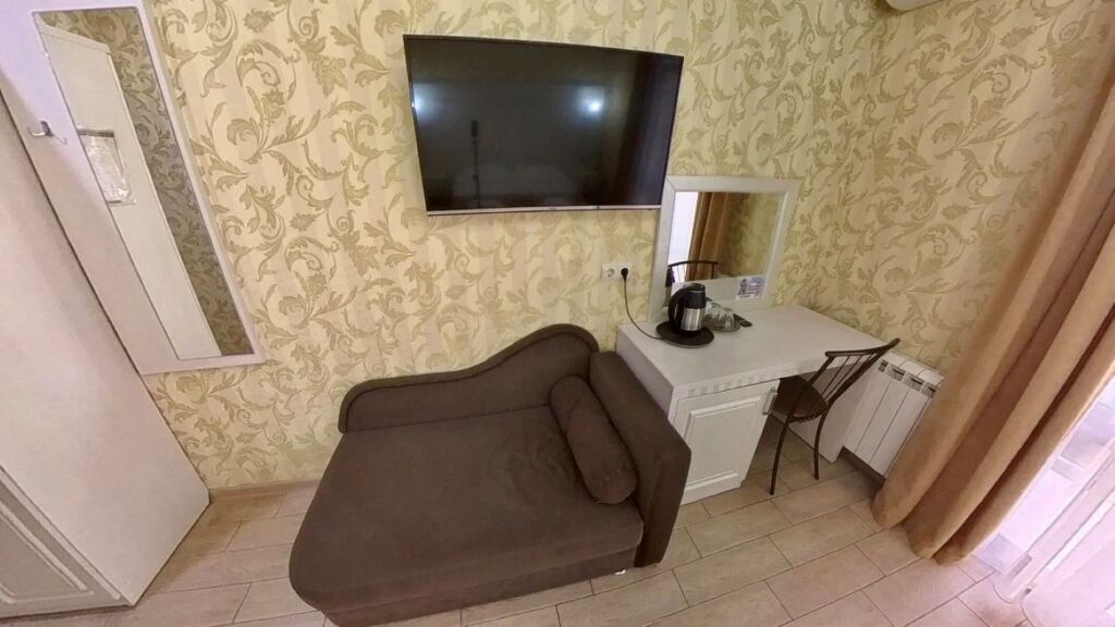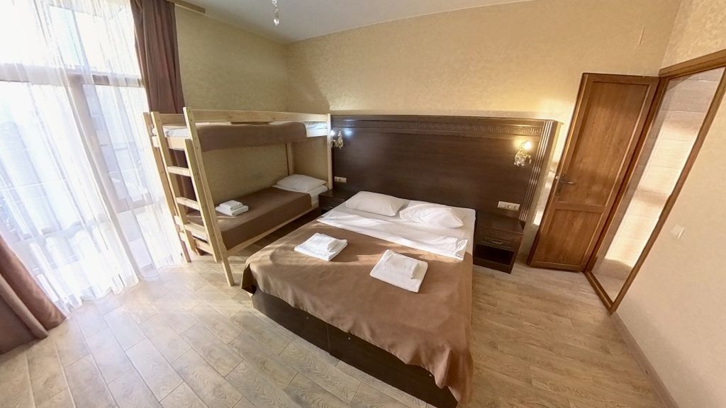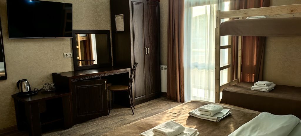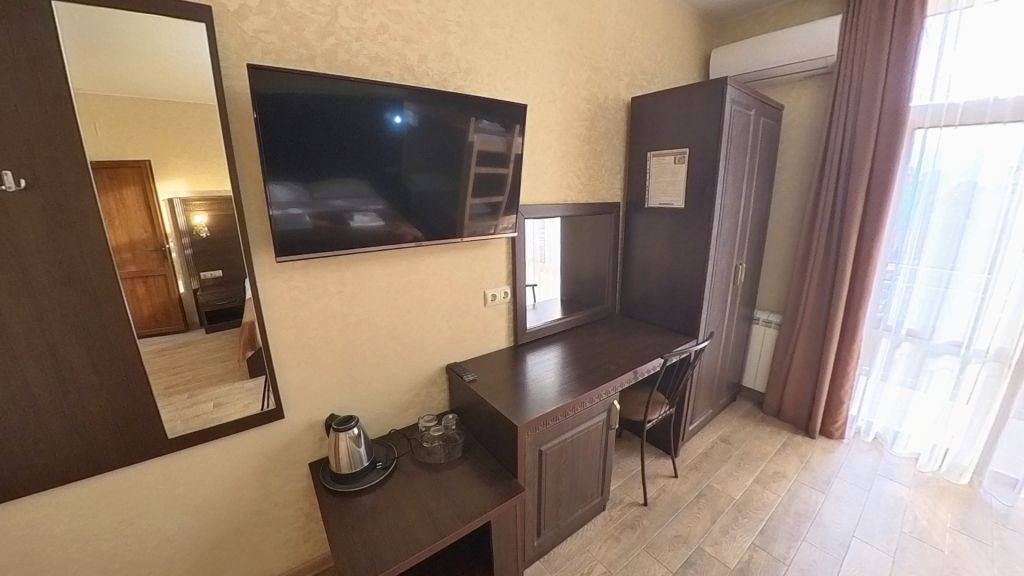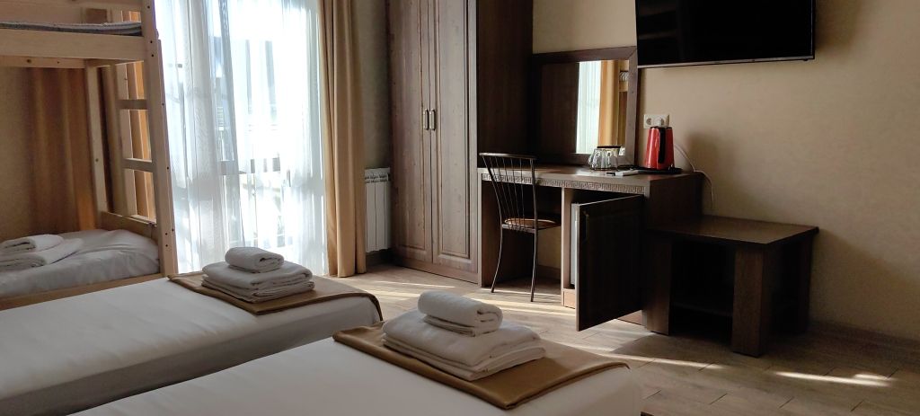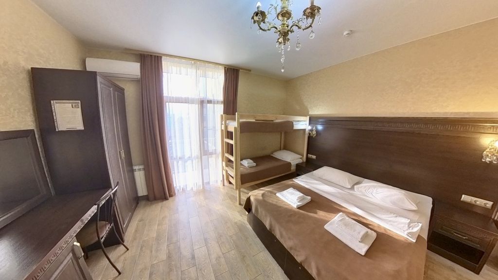 Комната с видом во внутренний двор, комната предназначена для проживания трех человек. Комната выполнена в современном стиле и спокойных цветовых тонах, оборудована всем необходимым: чайник, чайная пара, холодильник, кондиционер, что позволяет гостям чувствовать себя комфортно и наслаждаться всеми удобствами пребывания на отдыхе.