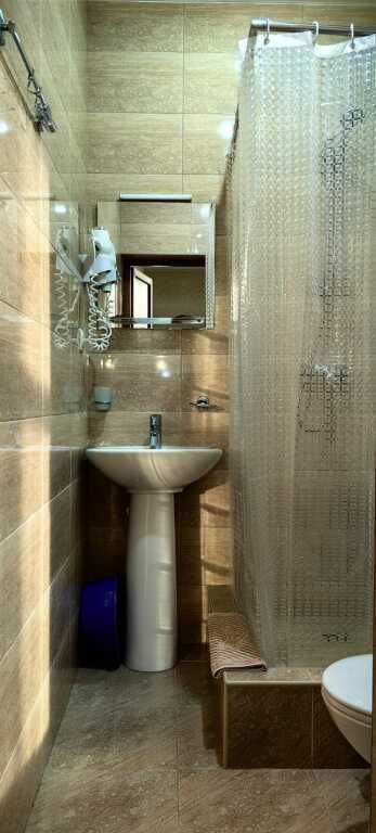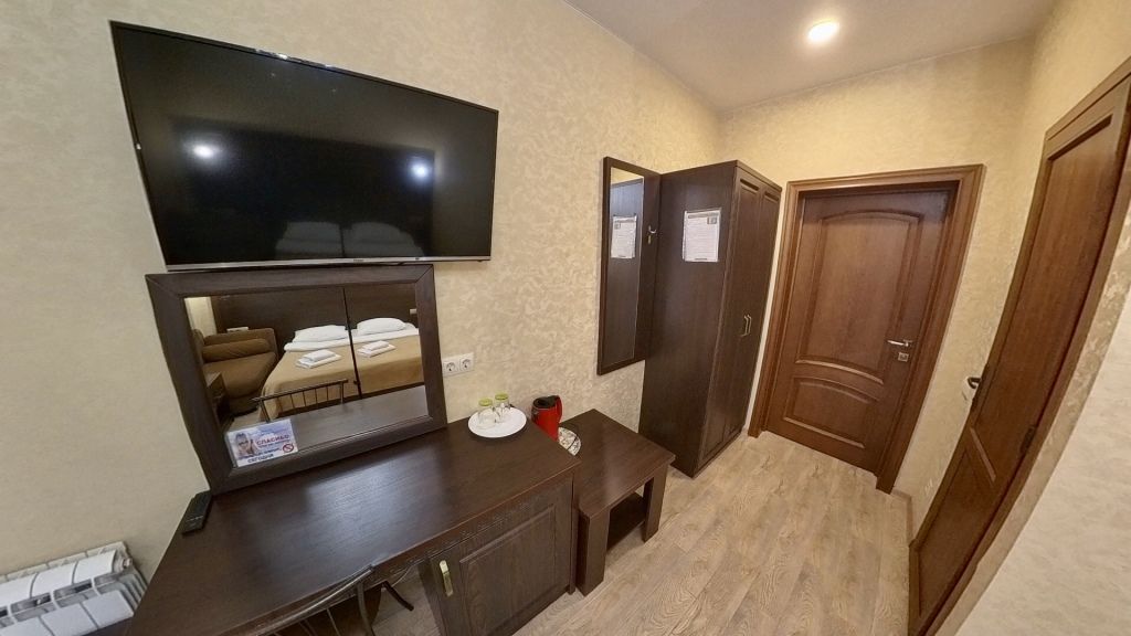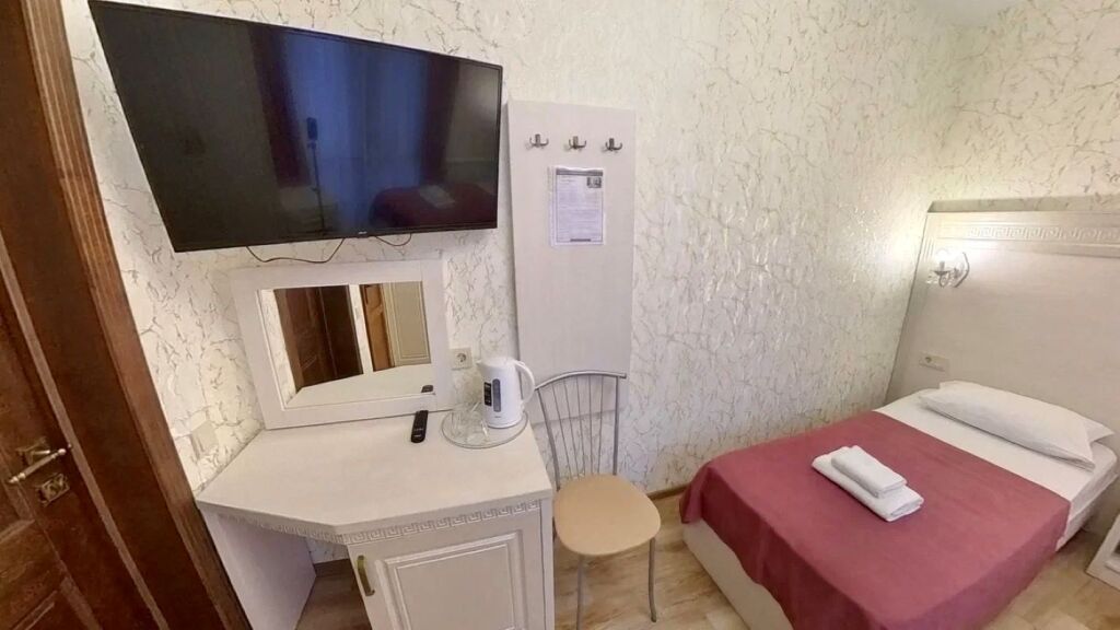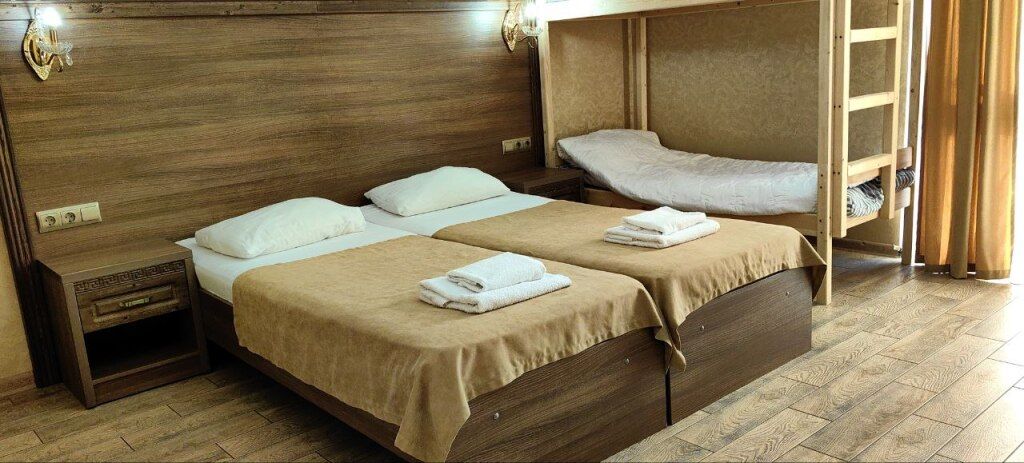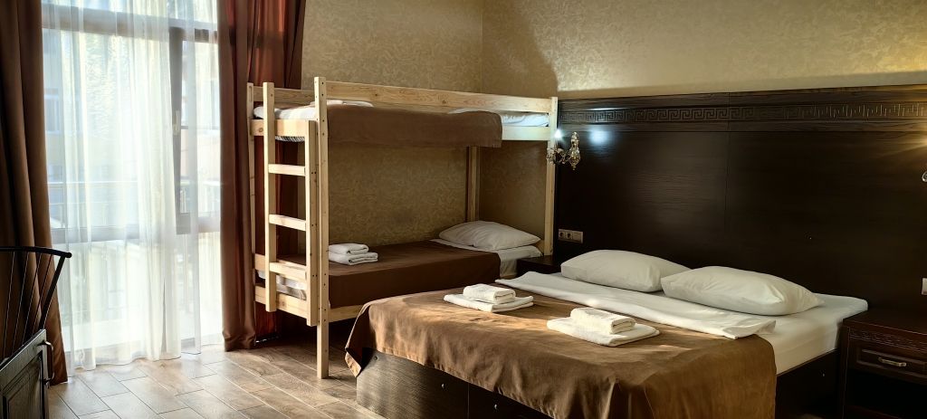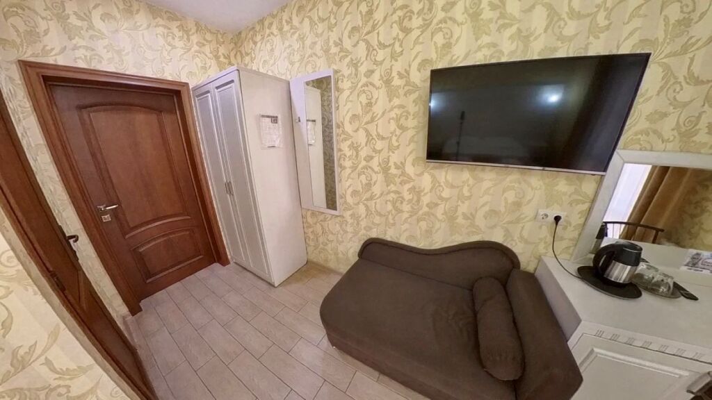 Комната с видом во внутренний двор, комната предназначена для проживания трех человек. Комната выполнена в современном стиле и спокойных цветовых тонах, оборудована всем необходимым: чайник, чайная пара, холодильник, кондиционер, что позволяет гостям чувствовать себя комфортно и наслаждаться всеми удобствами пребывания на отдыхе.