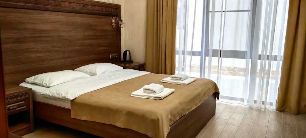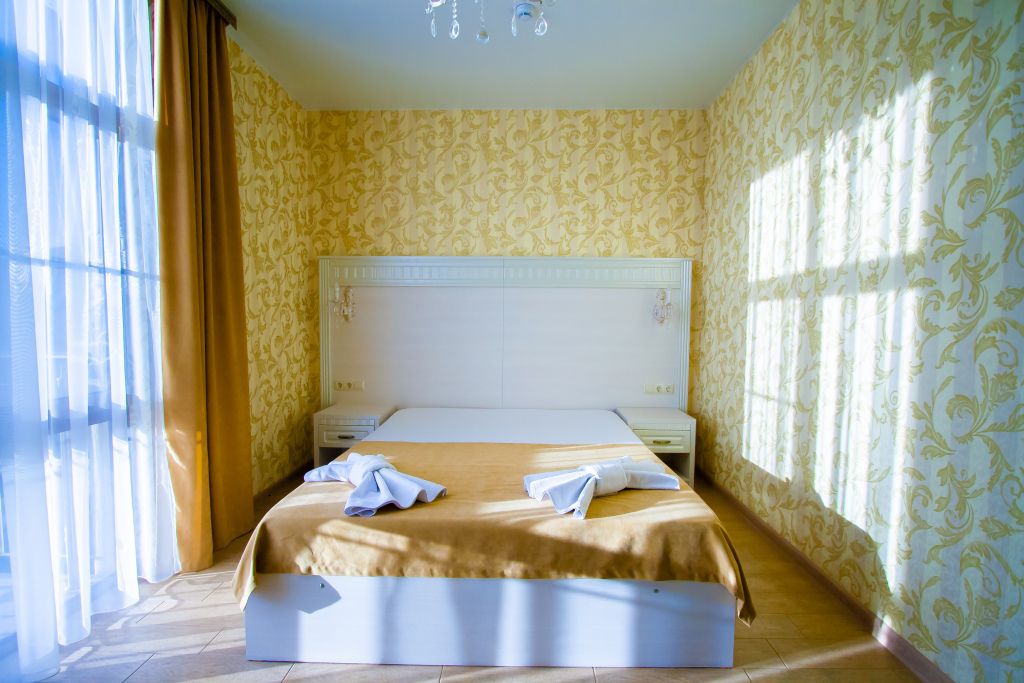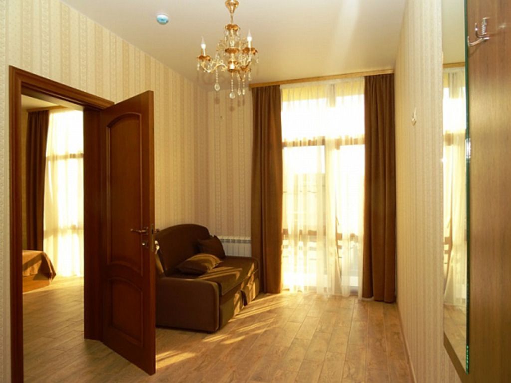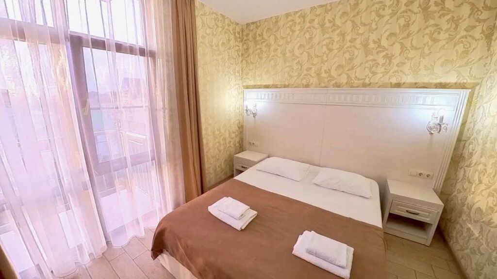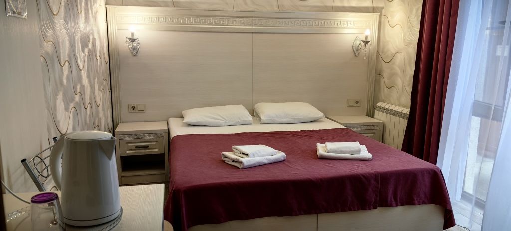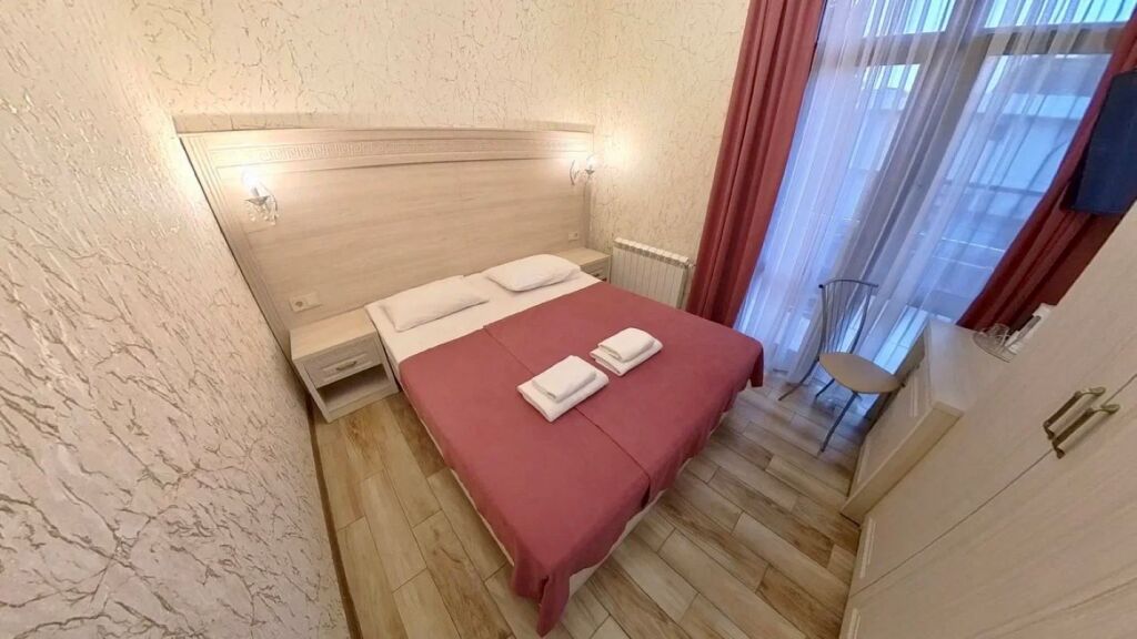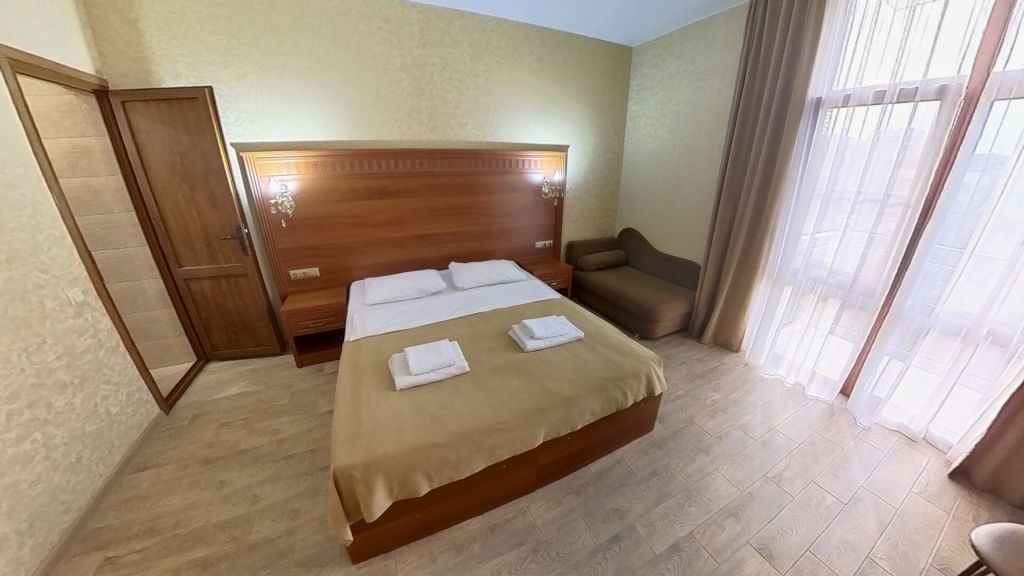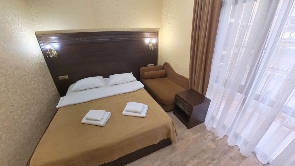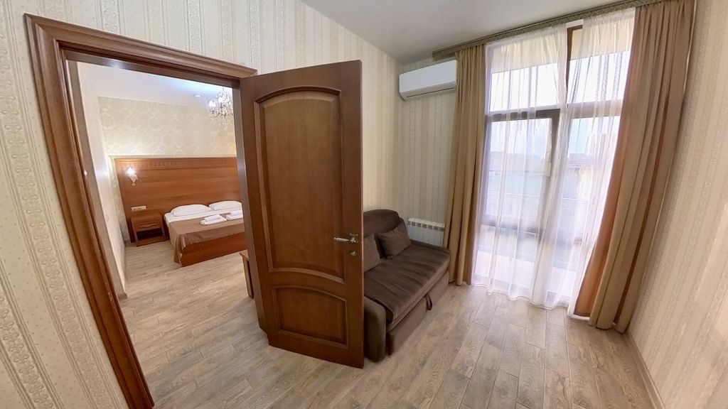 Две комнаты с балконом и видом во внутренний двор предназначены для проживания двух и более человек. Комната выполнена в современном стиле и спокойных цветовых тонах, оборудована всем необходимым: чайник, чайная пара, холодильник, кондиционер, что позволяет гостям чувствовать себя комфортно и наслаждаться всеми прелестями пребывания на отдыхе.