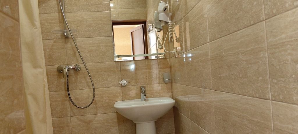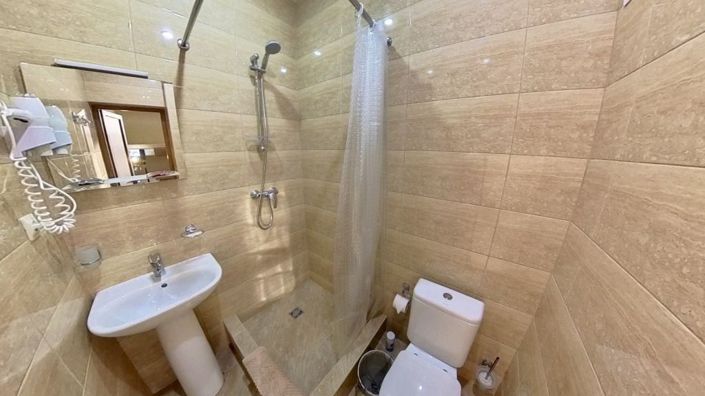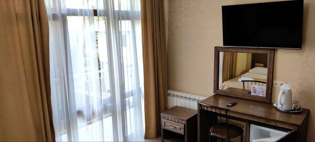 Комната с балконом и видом во внутренний двор предназначена для проживания трех человек. Комната выполнена в современном стиле и спокойных цветовых тонах, оборудована всем необходимым: чайник, чайная пара, холодильник, кондиционер, что позволяет гостям чувствовать себя комфортно и наслаждаться всеми прелестями пребывания на отдыхе.