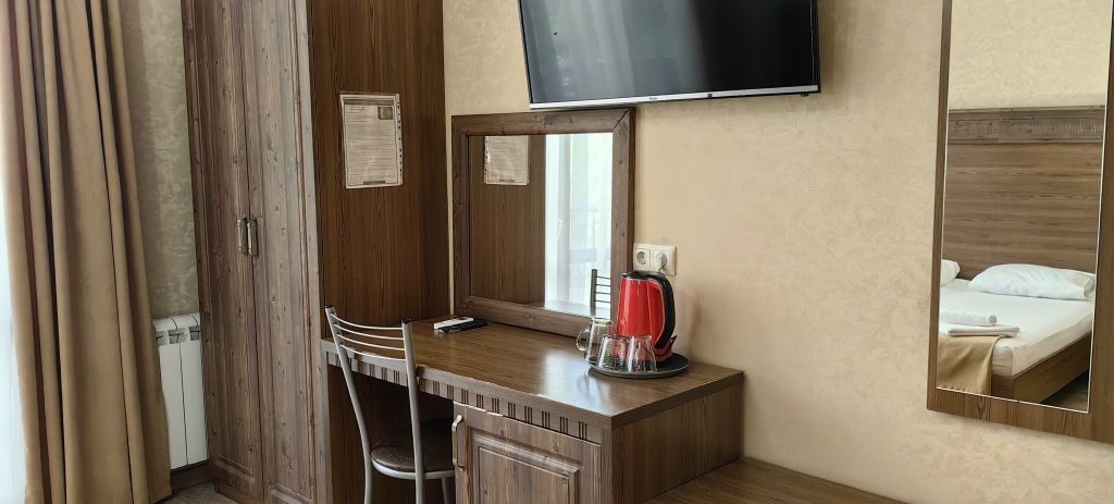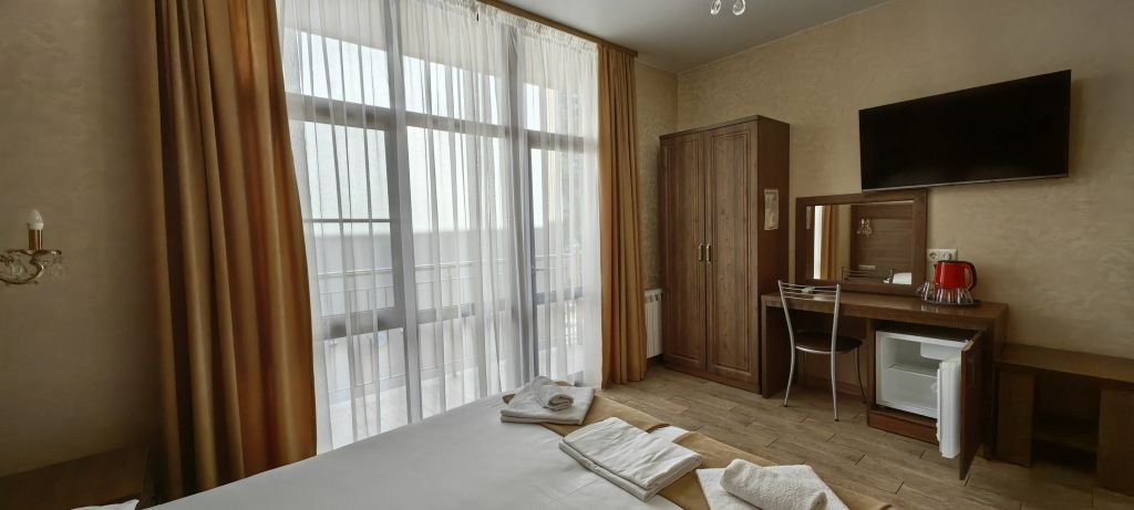 Комната с балконом и видом во внутренний двор, комната предназначена для проживания трех человек. Комната выполнена в современном стиле и спокойных цветовых тонах, оборудована всем необходимым: чайник, чайная пара, холодильник, кондиционер, что позволяет гостям чувствовать себя комфортно и наслаждаться всеми удобствами пребывания на отдыхе.