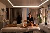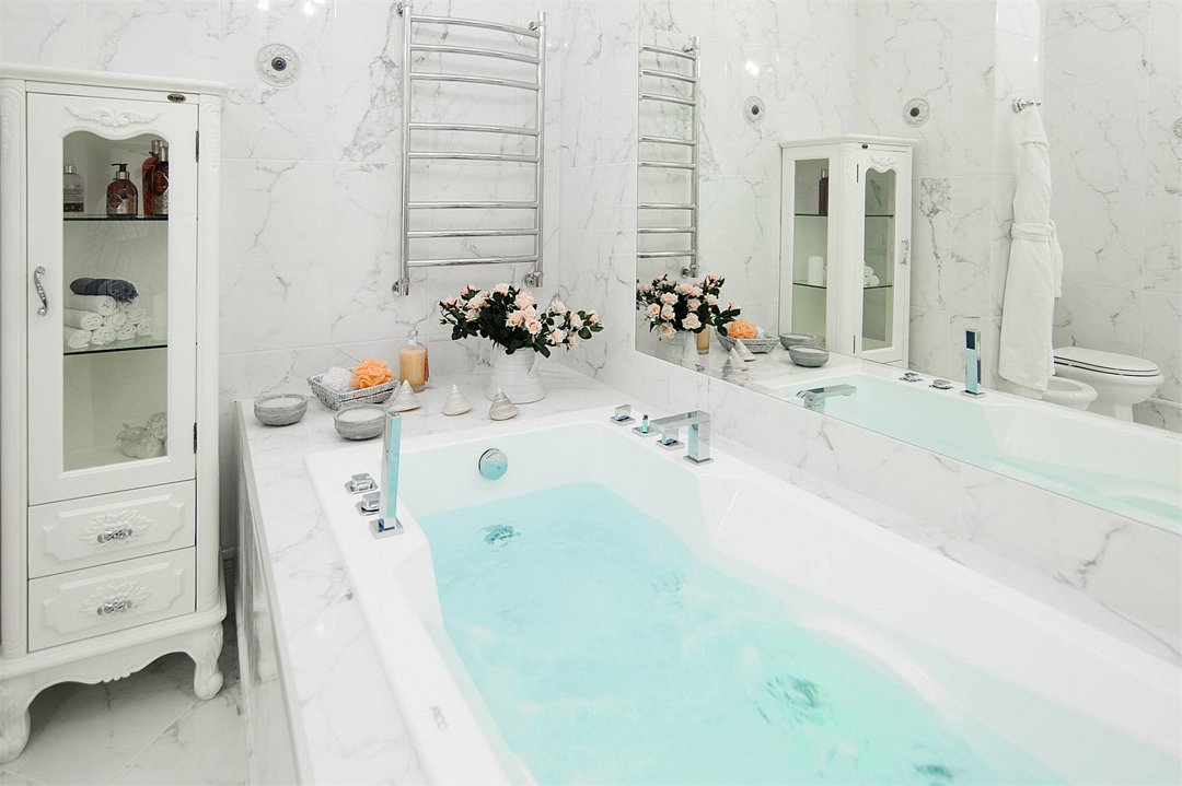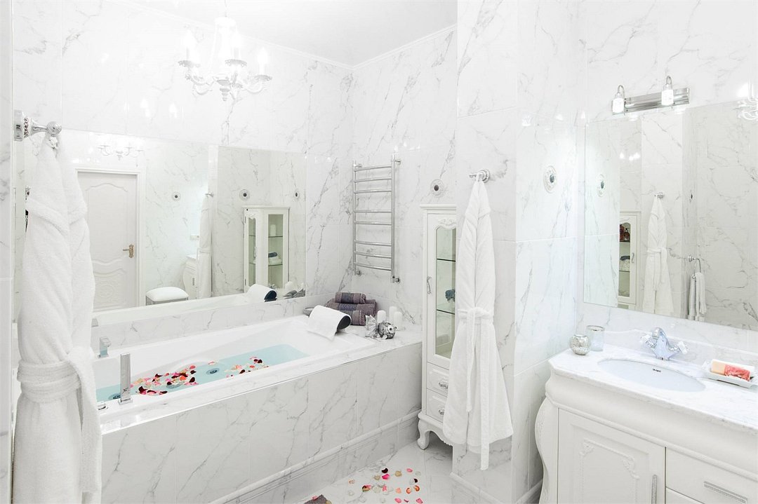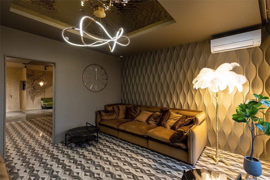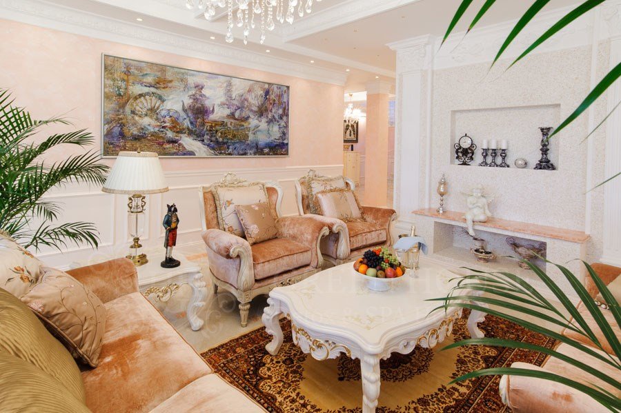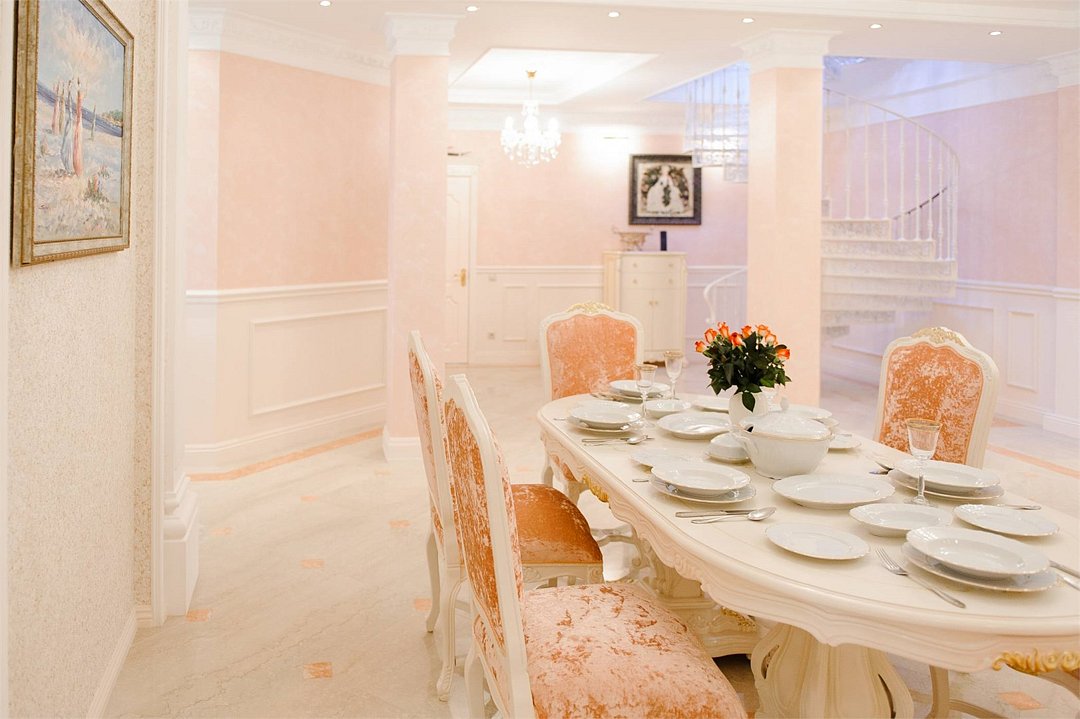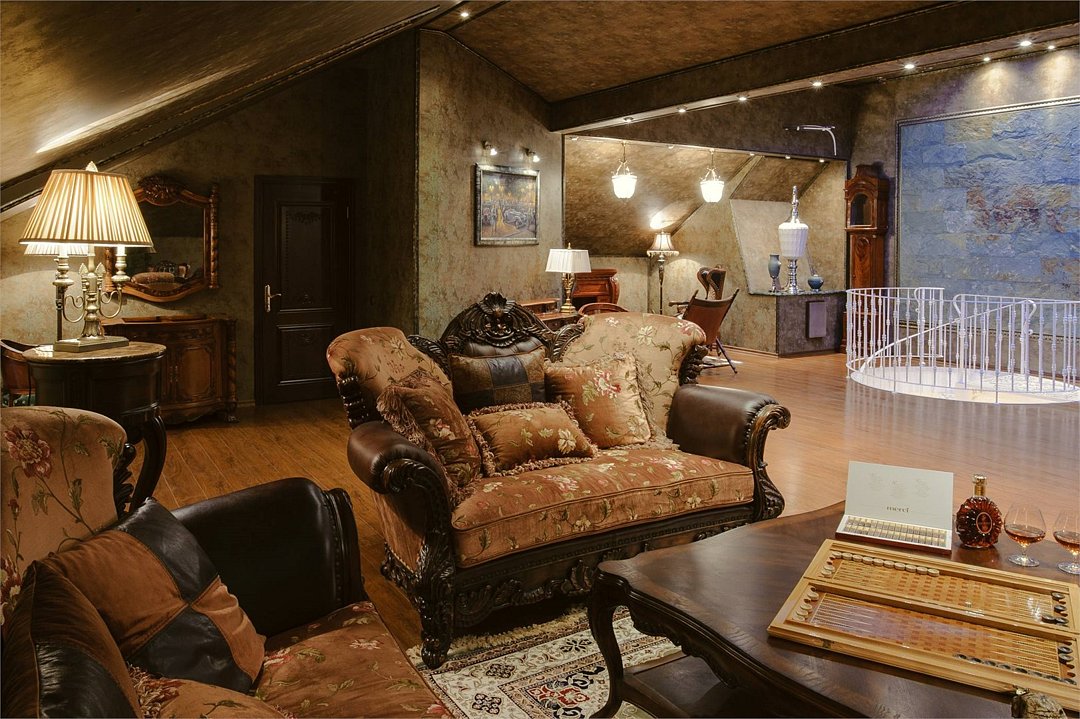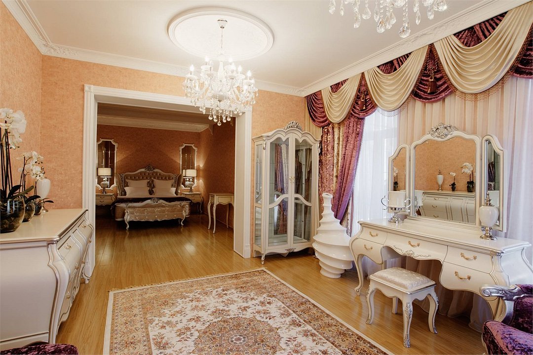Апартаменты расположены в двух уровнях. Первый уровень состоит из гостиной и столовой с кухней, разделенных на две зоны декоративной перегородкой, четырех спальных комнат и гостевой туалетной комнаты. Четыре спальные комнаты представлены: • Спальня с будуаром, с гардеробом и ванной комнатой, площадью 77 кв.м. • Спальня с гардеробом и ванной комнатой с душевой кабиной, площадью 48кв.м. • Две спальни, площадью 18 кв.м. Второй уровень состоит из гостиного салона с кинотеатром, баром, декоративным камином и представляет собой единое пространство. Апартаменты имеют самостоятельный вход и подъезд, а также гараж. Депозит при заезде 50 000 руб за сохранность имущества апартаментов (возвращается при отсутствии повреждений в апартаментах).Услуги и удобства