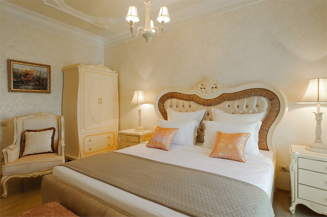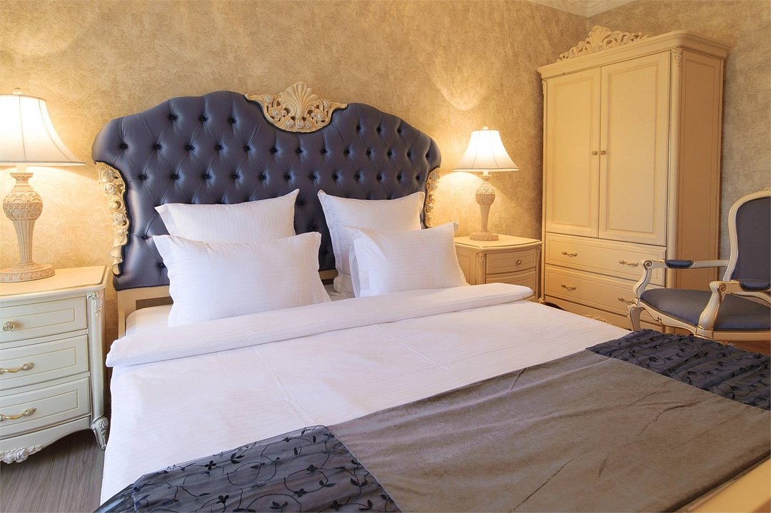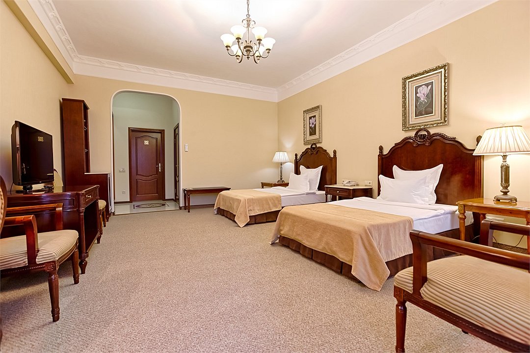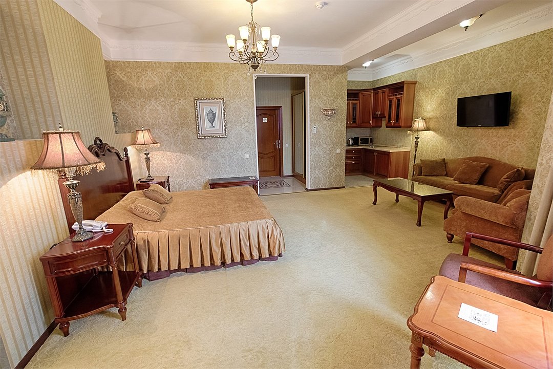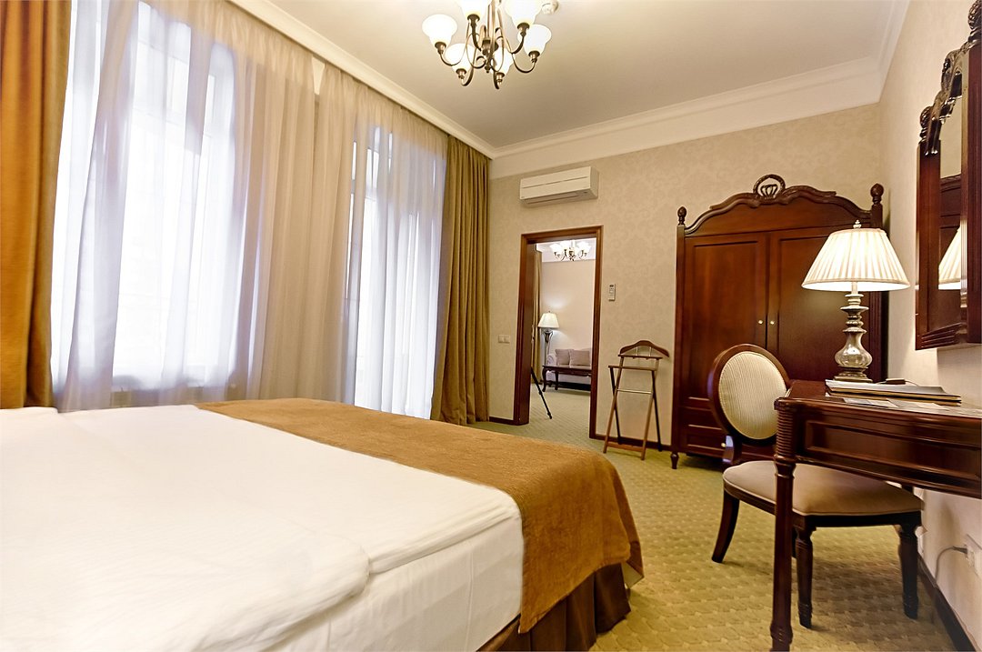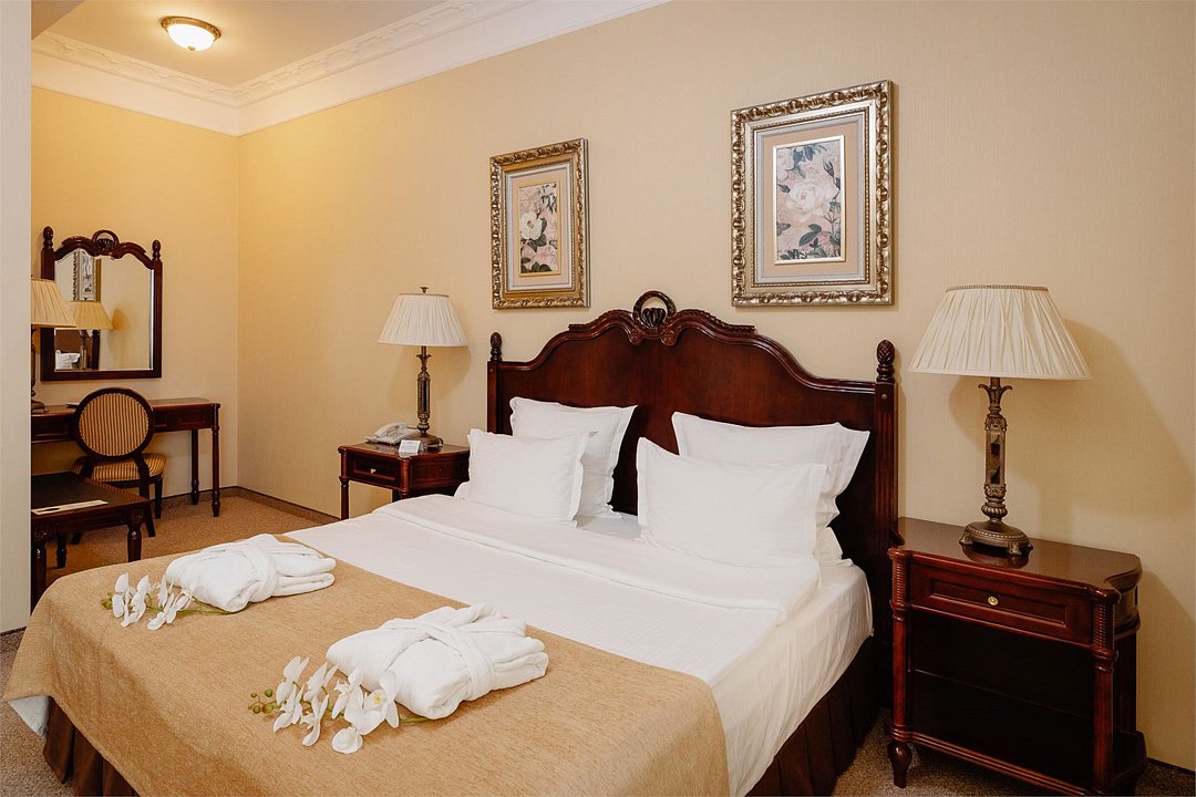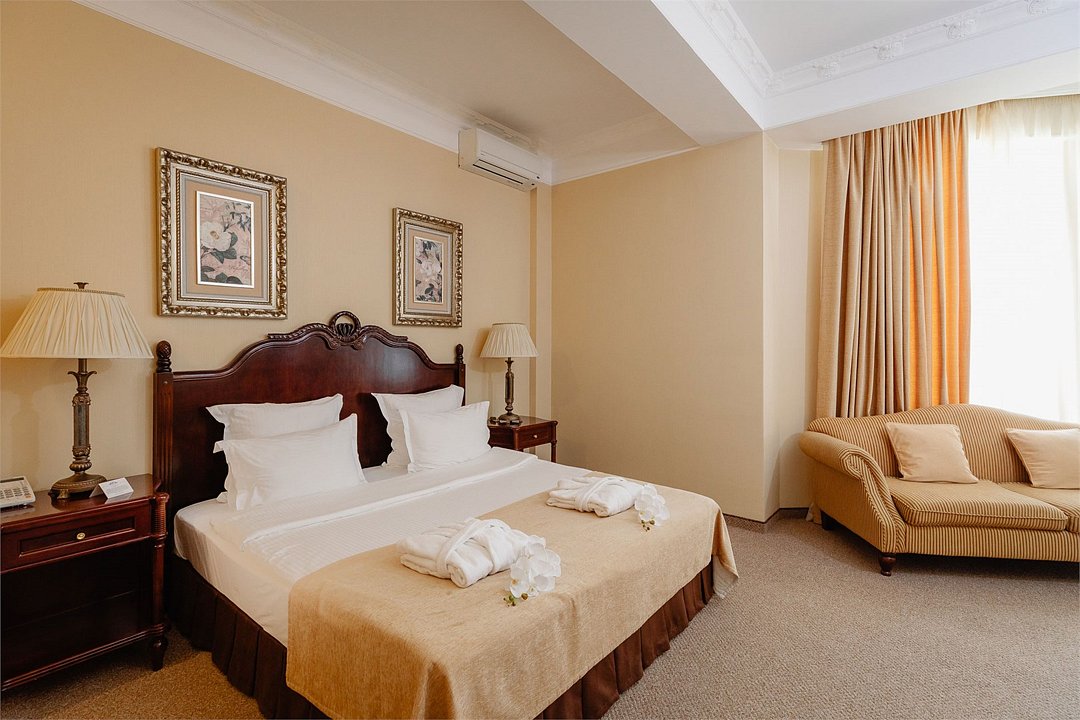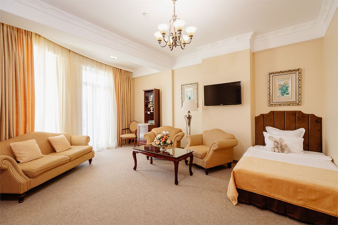 Представляет собой комфортабельный двухкомнатный номер, общей площадью 44 кв. м. Номер состоит из спальни и гостиной с выходом на балкон из каждой зоны, с видом на окрестности. Пространство отдыха и сна обустроено авторской мебелью в классическом стиле. Номера этой категории расположены на первом, втором и третьем этажах.Услуги и удобства