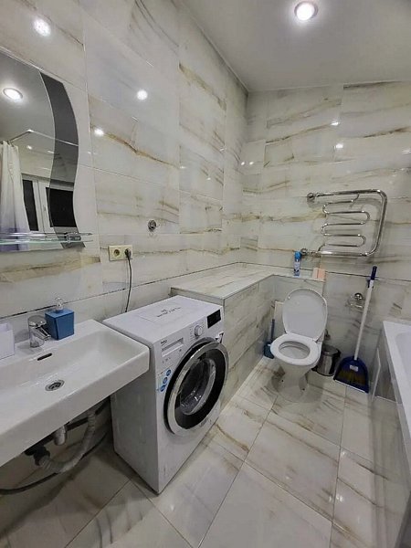 Имеется телевизор, кондиционер, шкаф, вешалка, обеденный стол, рабочий стол, комод, журнальный столик, стулья, кухня, посуда, столовые приборы, СВЧ, чайник, холодильник, электрическая плита, фен, стиральная машина, сушилка для белья. Индивидуальная ванная комната: ванна, раковина, туалет.