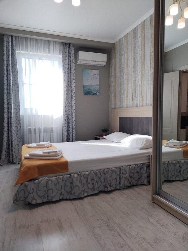 Апартаменты двухкомнатные четырёхместные с кухней площадью 50 кв.м. Подходят для размещения 4 человек. Имеет спальню с приятным интерьером.