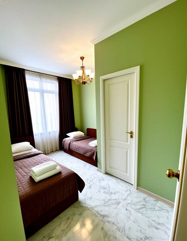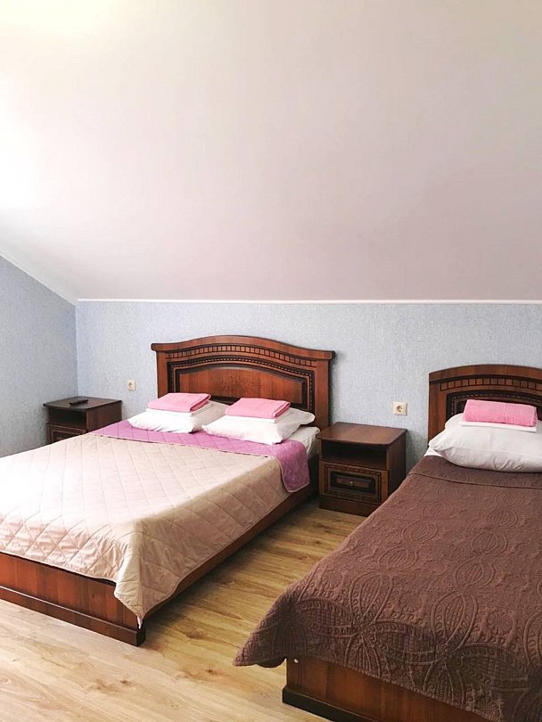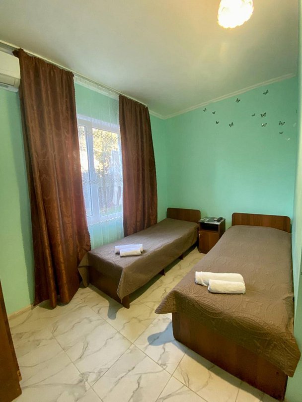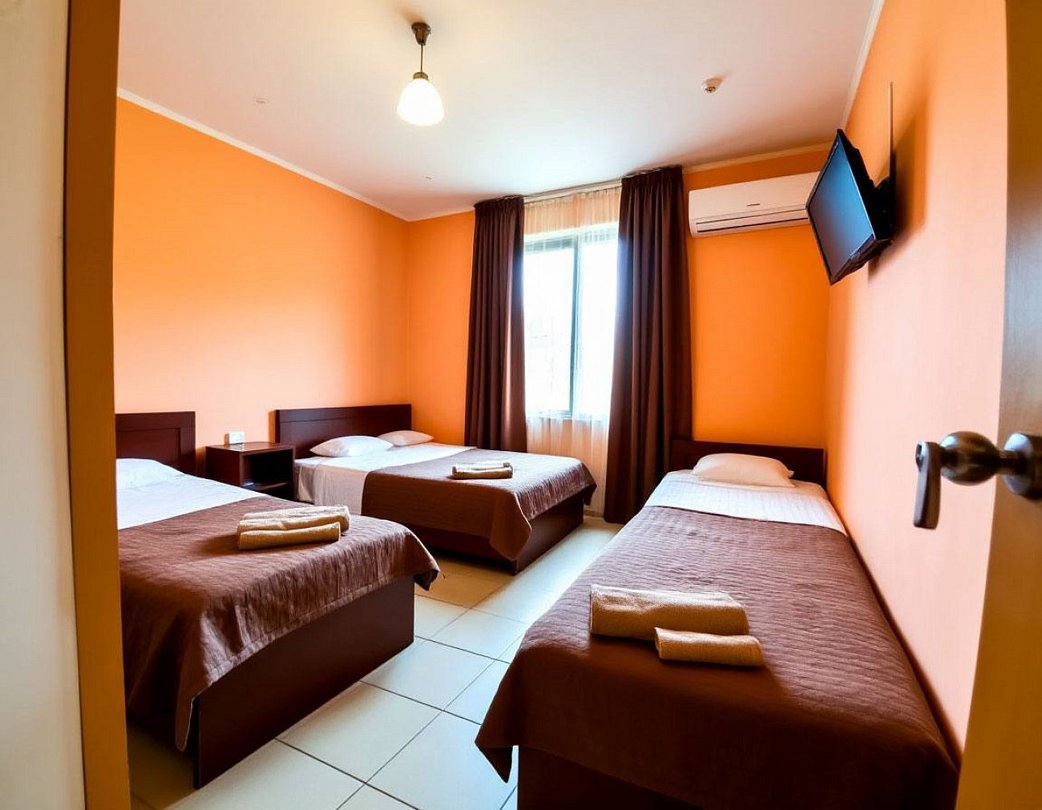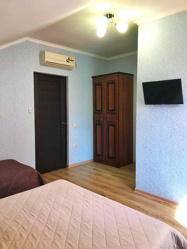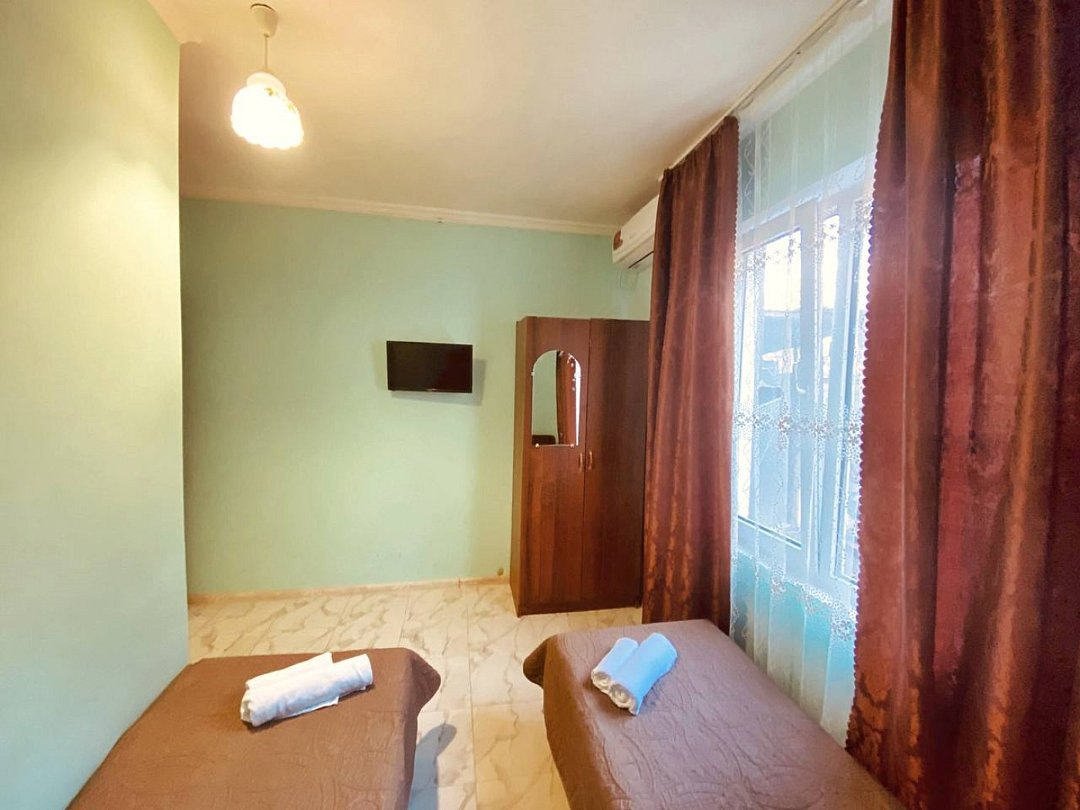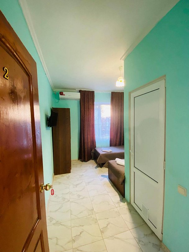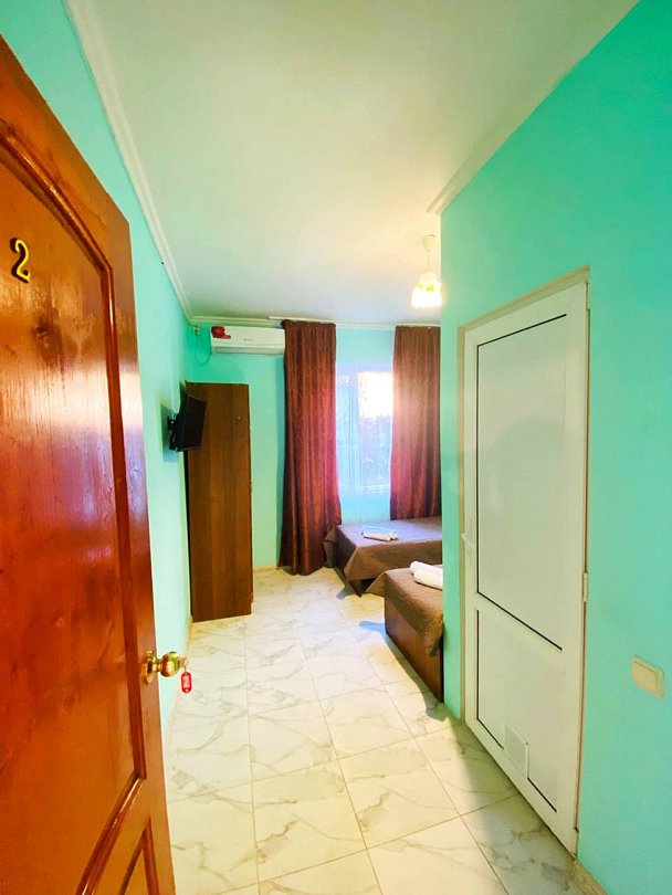 Четырех местный номер, расположен в гостевом доме "Вардане". В номере есть двуспальная кровать и несколько односпальных кроватей, телевизор и кондиционер. Санузел расположен в номере. Подходит для проживания четырех гостей. На территории гостевого дома имеется общая кухонная зона.