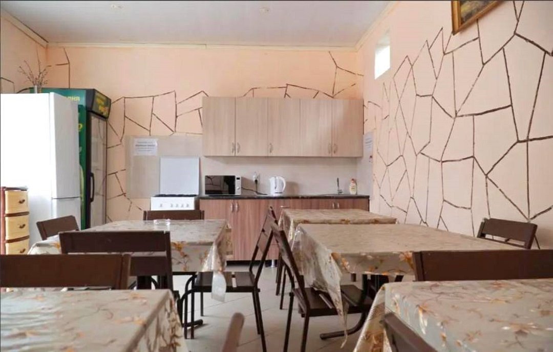 Для тех, кто предпочитает готовить самостоятельно, на территории есть общая кухня с необходимой посудой, холодильником и микроволновой печью. Здесь же расположен уютный зеленый двор с пальмами и цветами, где можно насладиться спокойствием, а также мангальная зона для вечерних посиделок. Во дворе предусмотрена парковка, что делает пребывание еще более удобным.