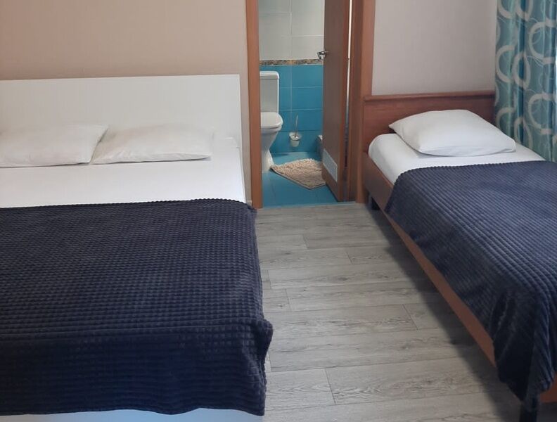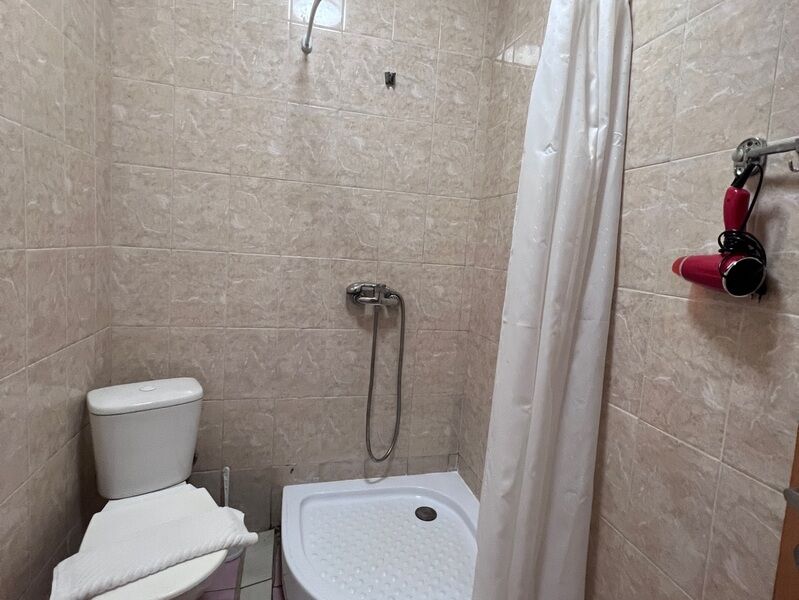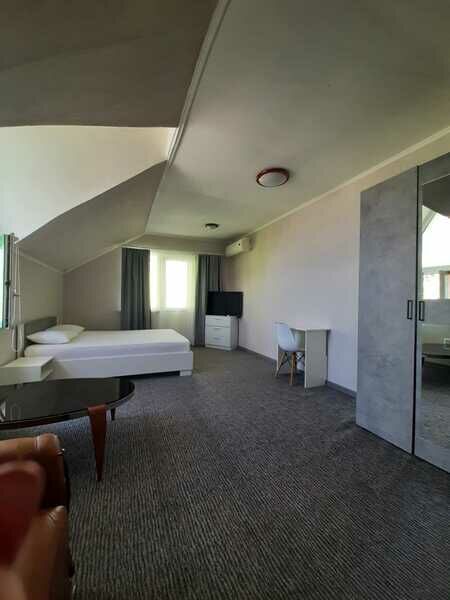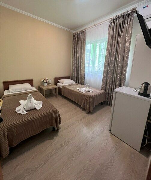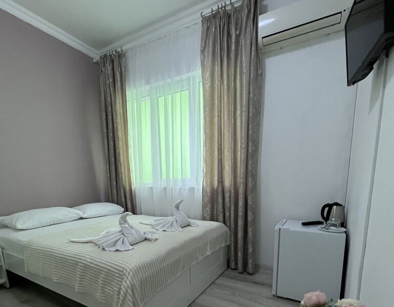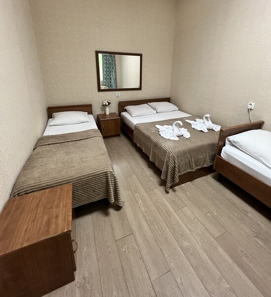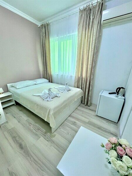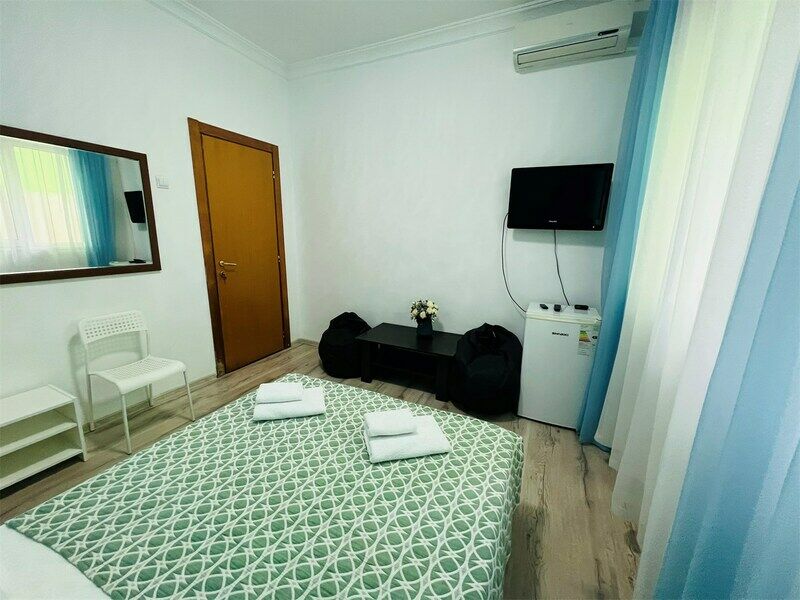 Дом находится на второй береговой линии всего в паре сотен метров от моря. К услугам гостей номера разных категорий: есть эконом варианты с общим санузлом, а есть апартаменты с собственной мини-кухней. В комнатах имеются кондиционер, небольшой холодильник и плазменный телевизор, на этаже — гладильные принадлежности.