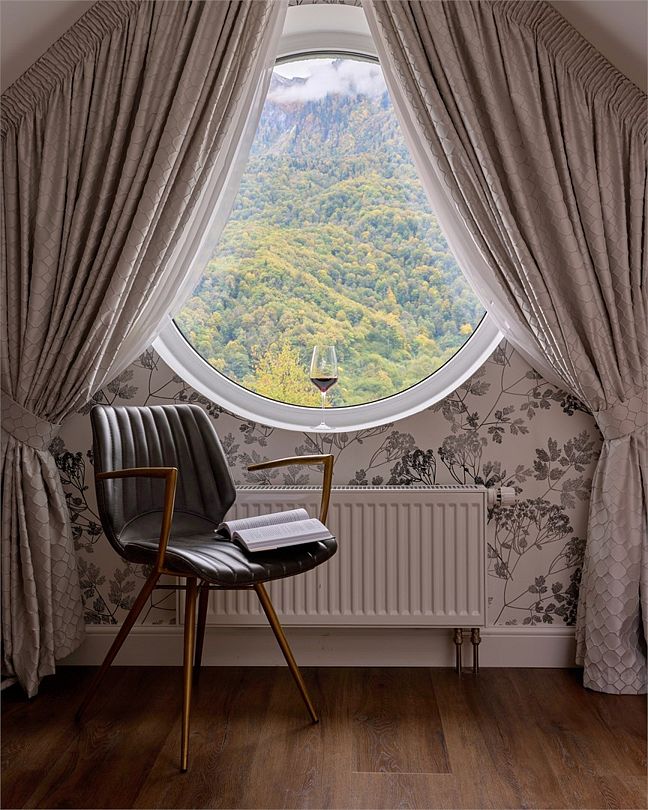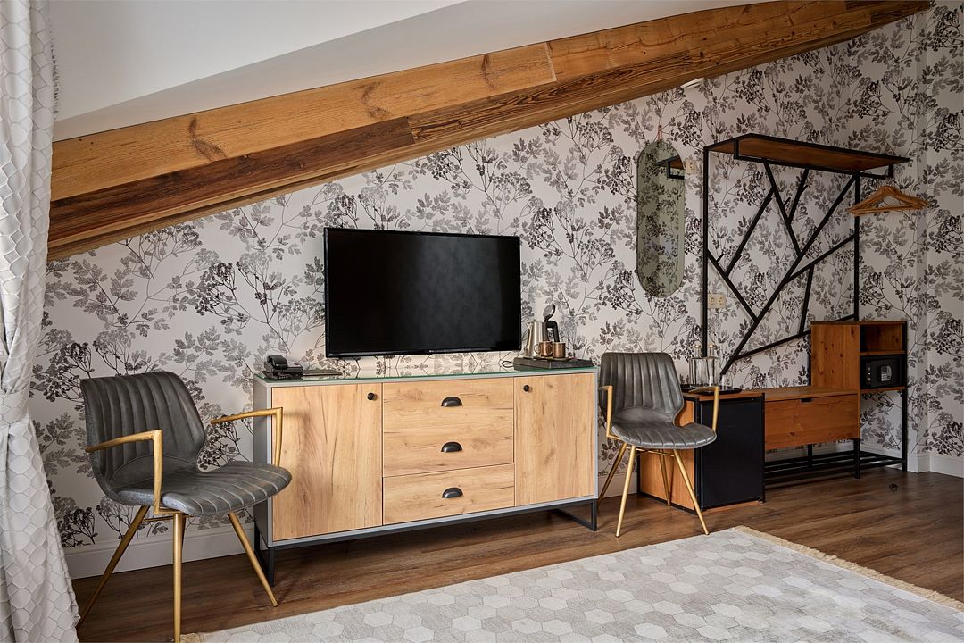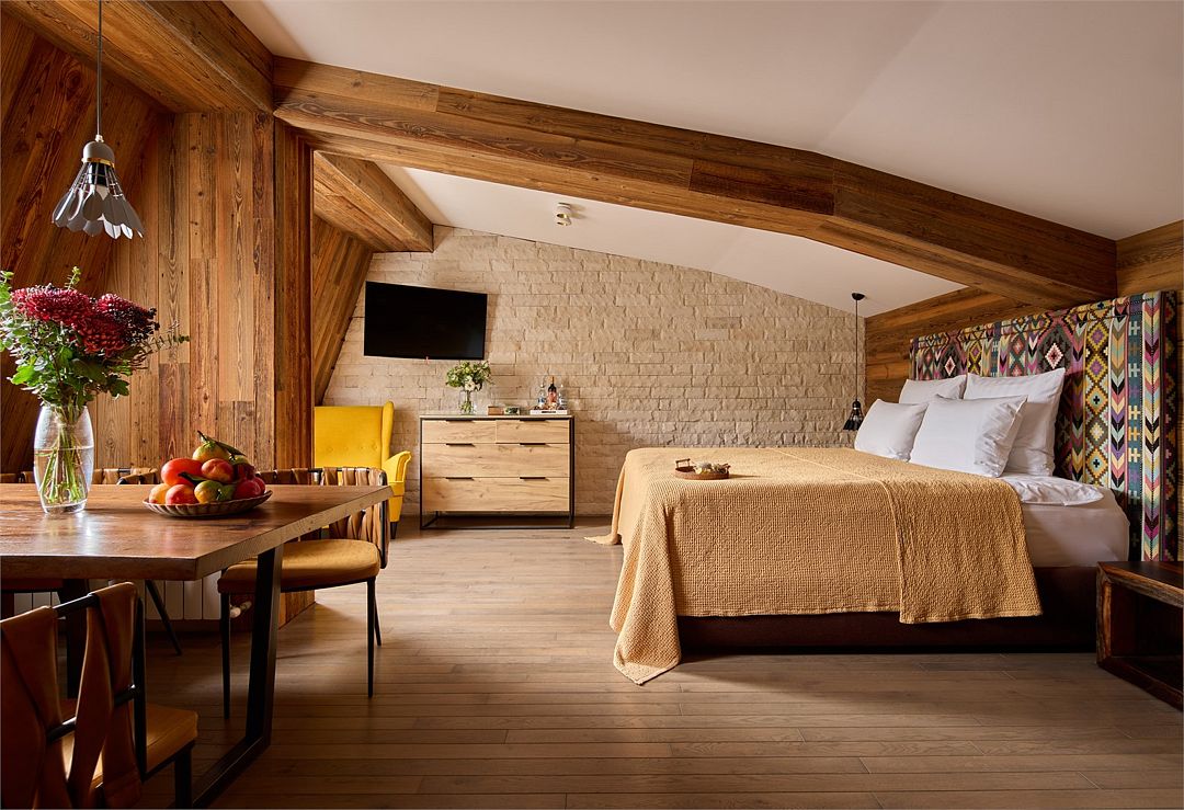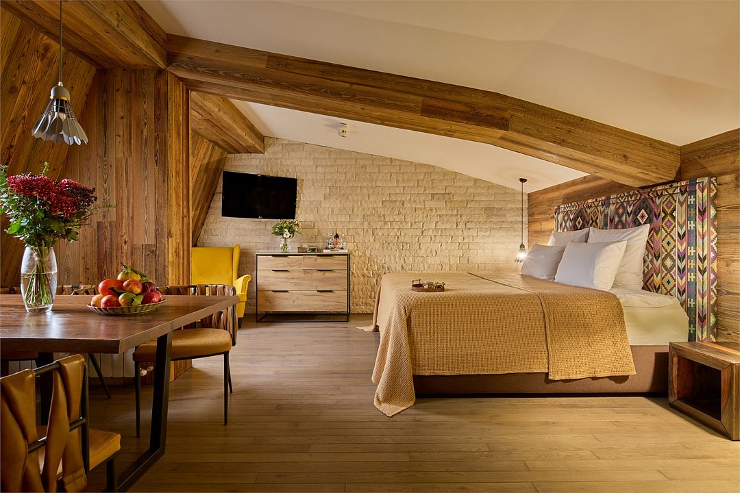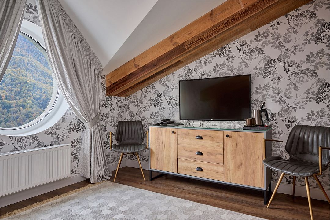 Wi-Fi, кондиционер, фен, весы, электронные замки, кофемашина, утюг, санузел, халаты, банные полотенца, тапочки, кровать «King size», кресла, эксклюзивная мебель, чайный набор, сейф, душ, диван-кровать, внутренний телефон, телевизор с плоским экраном, мини-холодильник, вид на горы, мансардные окна, номер для некурящих, чайная станция, услуги прачечной (платно), туалетные принадлежности премиум-класса, бутилированная вода, мини-бар (платно), можно с питомцамиВ гостиничном номере
