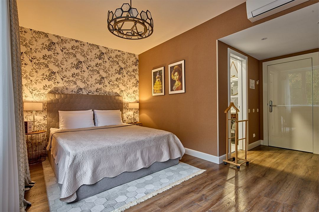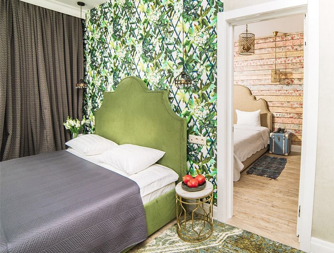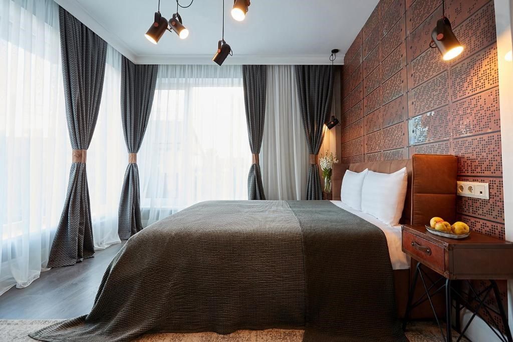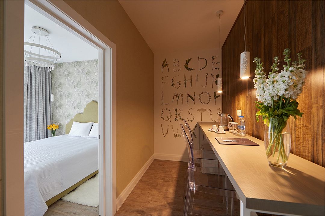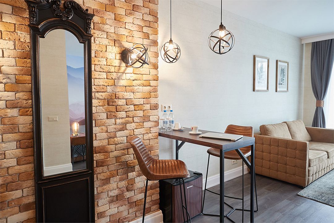 Двухкомнатный дизайнерский номер, оформленный в стиле Лофт, расположенный на первом этаже. Номер состоит из двух смежных номеров, объеденных общей дверью. В номере две двуспальные кровати размера King size. Ванные комнаты оснащены душевой кабиной. Для удобства в каждой ванной комнате имеется фен и косметические принадлежности: шампунь, кондиционер, гель для душа, мыло, косметический набор. Для Вашего комфорта в номере есть махровый халат и мягкие тапочки. В номере есть чайная станция и кофе-машина с кофейными капсулами от Julius Meinl, мини-бар с алкогольными и безалкогольными напитками, корзина искушений с выбором снеков премиального качества, бесплатный Wi-Fi и кондиционер. Из панорамных окон номера открывается вид на внутренний дворик отеля, улицу и частичный вид на горы. Для гостей, выбирающих номера повышенной комфортности посещение SPA-центра (сауна, хамам, соляная пещера, зал релаксации) предоставляется комплиментарно в утренние и дневные часы (сеансы: 10:00, 12:00, 14:00, 16:00).Услуги и удобства