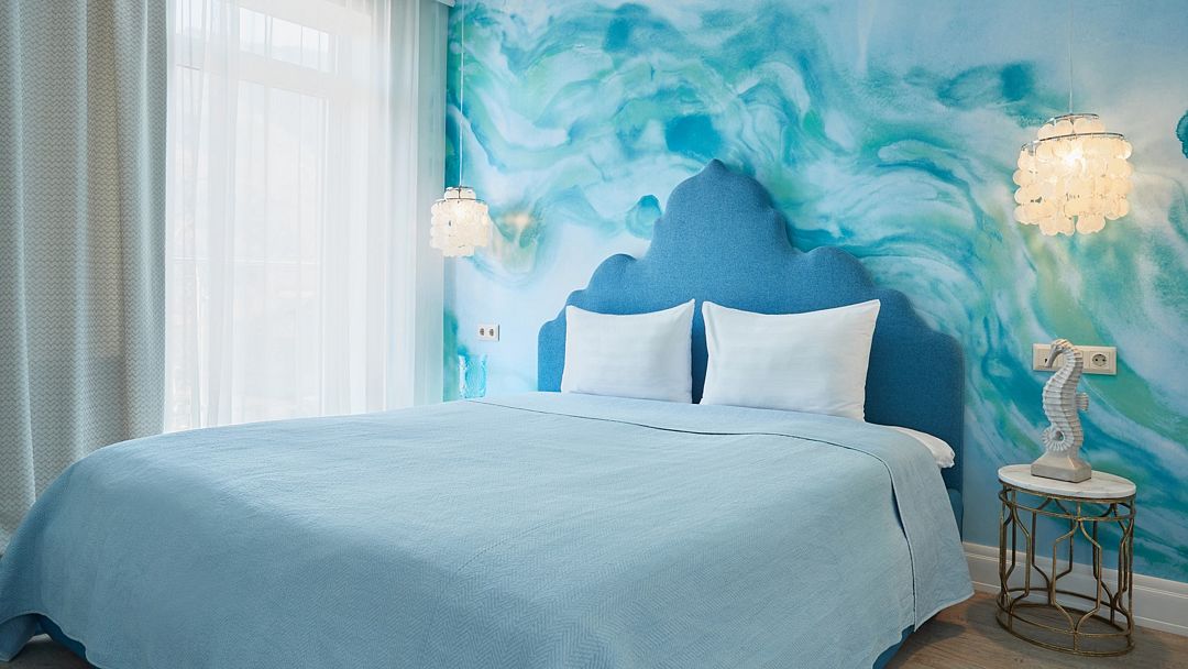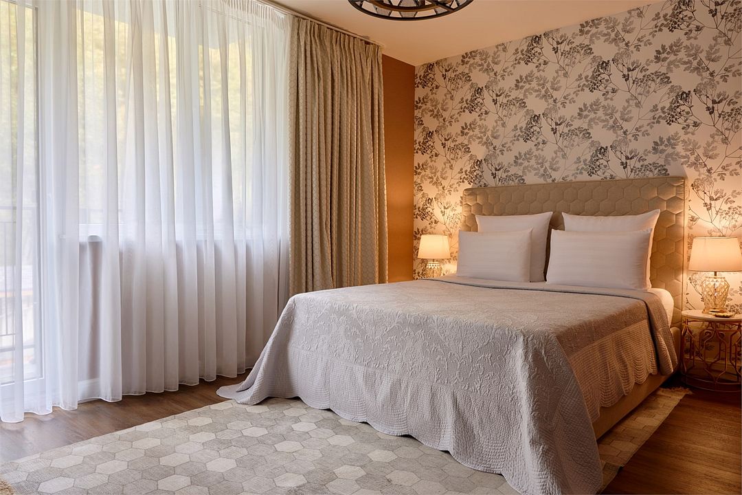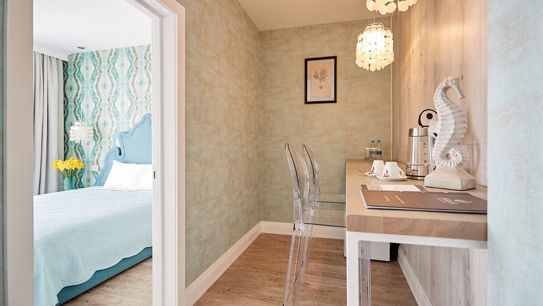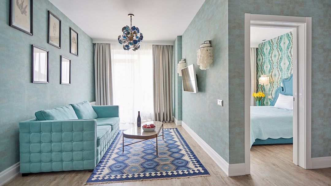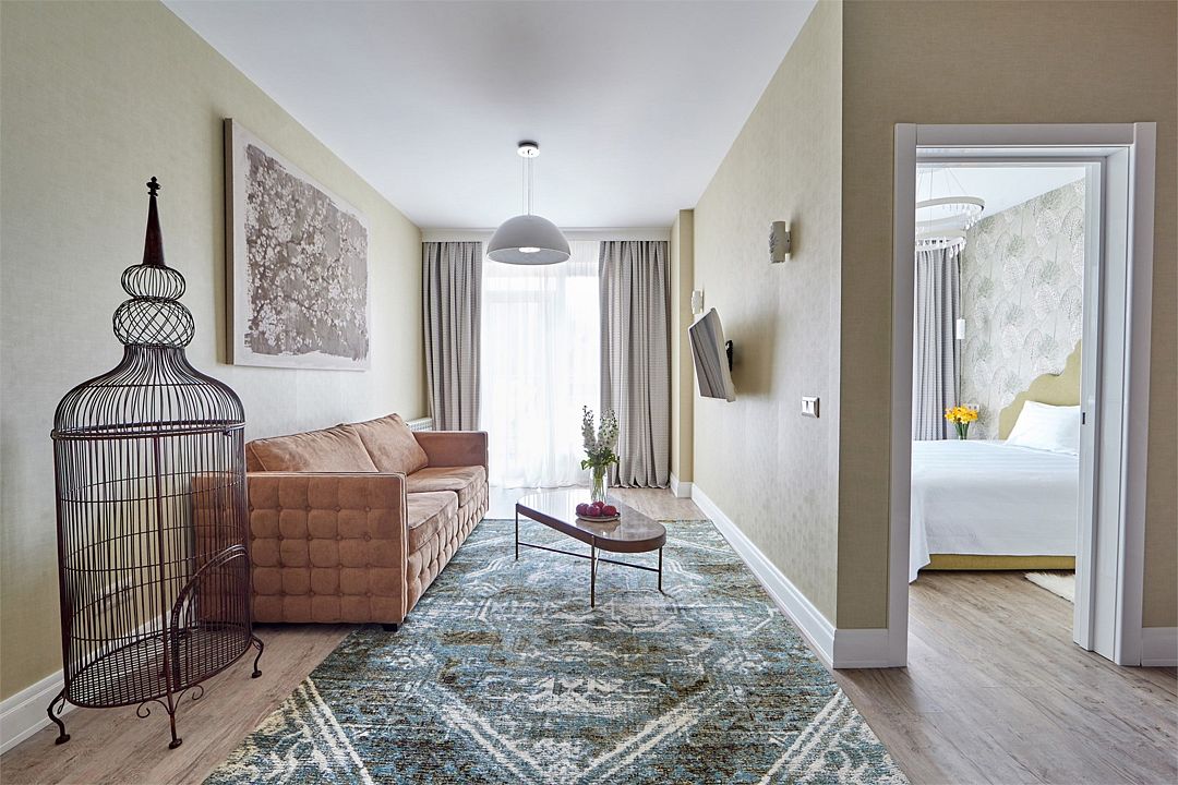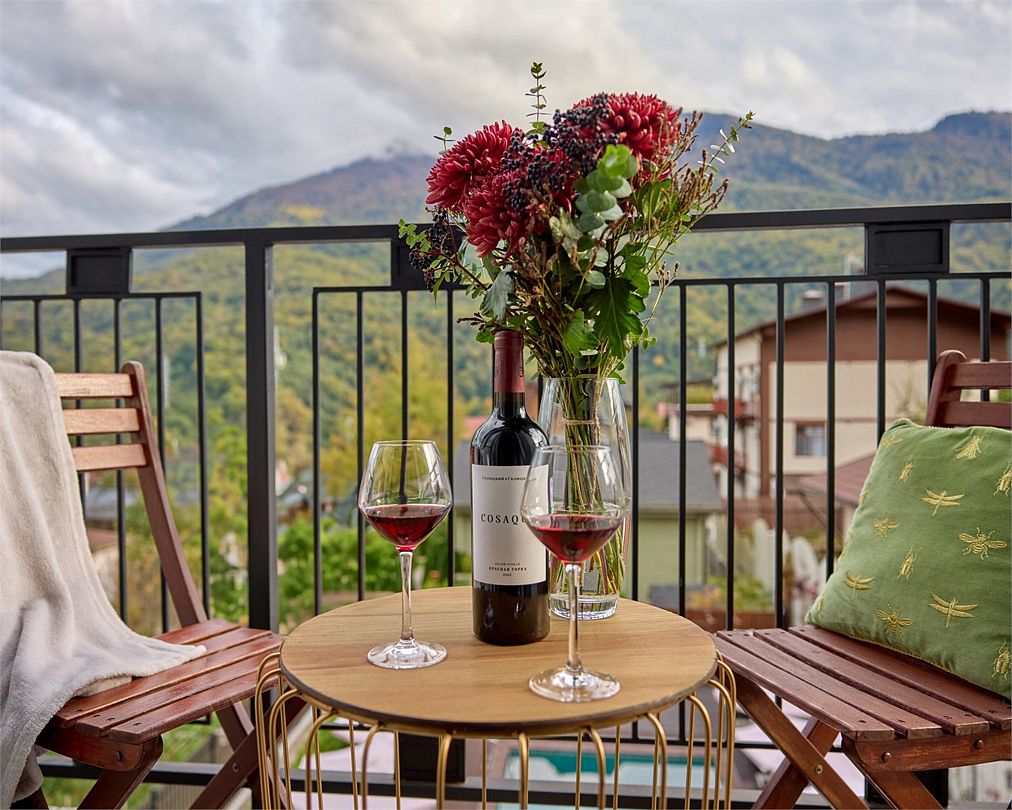 Двухкомнатный дизайнерский номер с балконом и видом на Кавказские горы, оформленный в стиле Прованс. Номер состоит из двух смежных номеров, объеденных общей дверью. В номере две двуспальные кровати размера King size. Ванные комнаты оснащены душевой кабиной. Для удобства в каждой ванной комнате имеется фен и косметические принадлежности: шампунь, кондиционер, гель для душа, мыло, косметический набор. Для Вашего комфорта в номере есть махровый халат и мягкие тапочки. В номере есть чайная станция и кофе-машина с кофейными капсулами от Julius Meinl, мини-бар с алкогольными и безалкогольными напитками, корзина искушений с выбором снеков премиального качества, бесплатный Wi-Fi и кондиционер. Из панорамных окон номера и балкона открывается вид на внутренний дворик отеля, улицу и Кавказские горы. Для гостей, выбирающих номера повышенной комфортности посещение SPA-центра (сауна, хамам, соляная пещера, зал релаксации) предоставляется комплиментарно в утренние и дневные часы (сеансы: 10:00, 12:00, 14:00, 16:00).Услуги и удобства