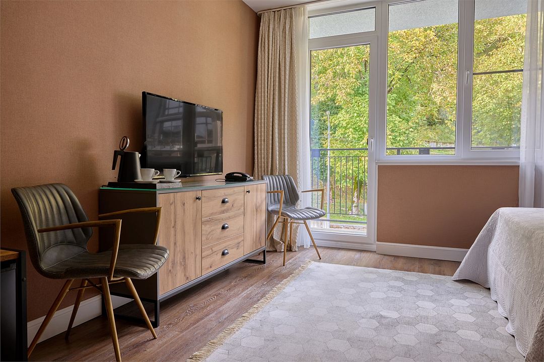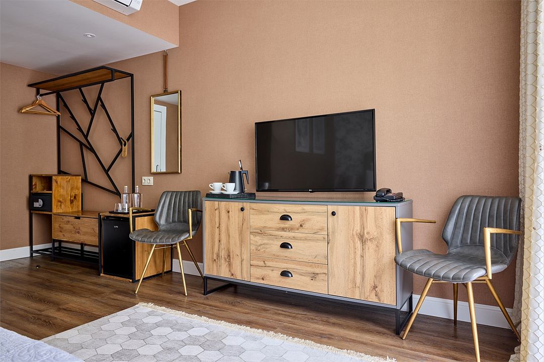 телевизор, Wi-Fi, телефон, кондиционер, фен, весы, утюг, халаты, тапочки, гигиенические средства, косметические средства, односпальная кровать, сейф, душ, туалетные средства, вид на горы, чайная станция, умная колонка, можно с питомцамиВ гостиничном номере