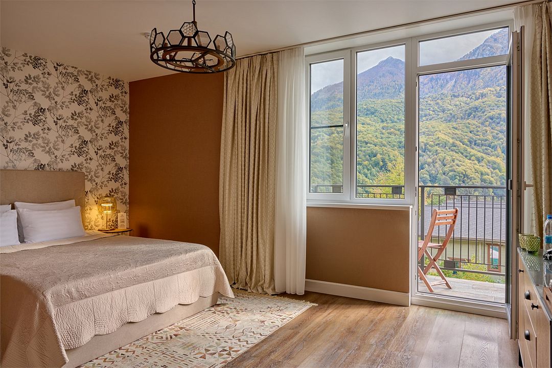 Современный молодёжный дизайн номера в сочетании с потрясающими видами на Кавказские горы делают обстановку комфортной и незабываемой. Уютный однокомнатный номер c одной двуспальной кроватью. Ванная комната оснащена душевой кабиной. Для удобства в ванной комнате имеется фен и косметические принадлежности: шампунь, кондиционер, гель для душа, мыло, косметический набор. Для Вашего комфорта в номере есть махровый халат и мягкие тапочки. В номере есть чайная станция, мини-бар с алкогольными и безалкогольными напитками, бесплатный Wi-Fi и кондиционер. Из окон номера открывается вид на бассейн и горы хребта Аибга. Максимальное размещение в номере 3 места: 2 основных местах (двуспальная кровать) + 1 дополнительное место (еврораскладушка)Услуги и удобства