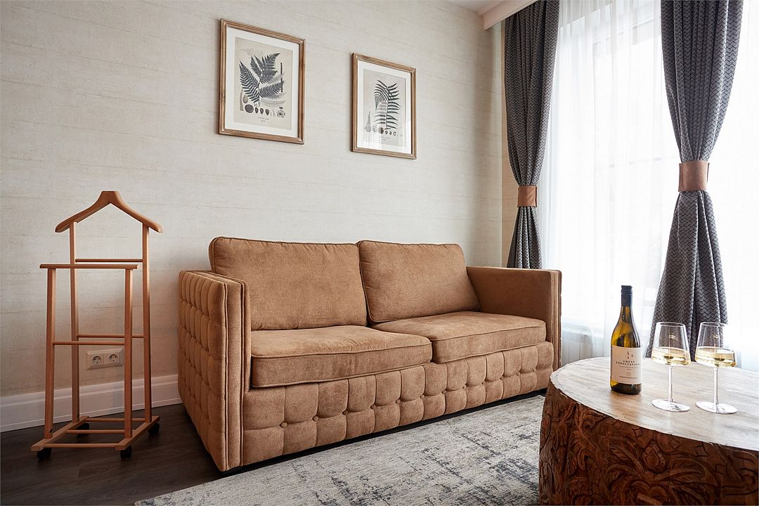Просторный дизайнерский однокомнатный номер повышенной комфортности c двуспальной кроватью King size и диваном-кроватью. Ванная комната оснащена душевой кабиной. Для удобства в ванной комнате имеется фен и косметические принадлежности: шампунь, кондиционер, гель для душа, мыло, косметический набор. Для Вашего комфорта в номере есть махровый халат и мягкие тапочки. В номере есть чайная станция и кофе-машина с кофейными капсулами от Julius Meinl, мини-бар с алкогольными и безалкогольными напитками, корзина искушений с выбором снеков премиального качества, бесплатный Wi-Fi и кондиционер. Для гостей, выбирающих номера повышенной комфортности посещение SPA-центра (сауна, хамам, соляная пещера, зал релаксации) предоставляется комплиментарно в утренние и дневные часы (сеансы: 10:00, 12:00, 14:00, 16:00). *Дизайн и оформление номеров может отличаться от указанных на фотографиях. Номера данной категории расположены на первом и мансардном этаже и мы не гарантируем размещение в конкретном номереУслуги и удобства
