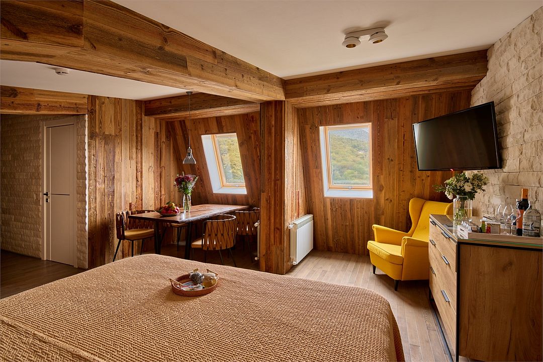 Уютный дизайнерский однокомнатный номер, расположенный на четвёртом этаже в мансарде. Из иллюминаторов номера открывается вид на бассейн и завораживающий вид горы хребта Аибга. В интерьере номеров в мансарде использовано натуральное дерево, что делает номер уникальным и экологичным. В США и Европе этот вид отделки известен давно, там его называют reclaimed wood — «дерево, получившее вторую жизнь». В номере одна двуспальная кровать или две раздельные кровати (по вашему запросу). Ванная комната оснащена небольшой ванной. Для удобства в ванной комнате имеется фен и косметические принадлежности: шампунь, кондиционер, гель для душа, мыло, косметический набор. Для Вашего комфорта в номере есть махровый халат и мягкие тапочки. В номере есть чайная станция, мини-бар с алкогольными и безалкогольными напитками, бесплатный Wi-Fi и кондиционер.Услуги и удобства