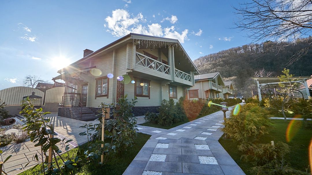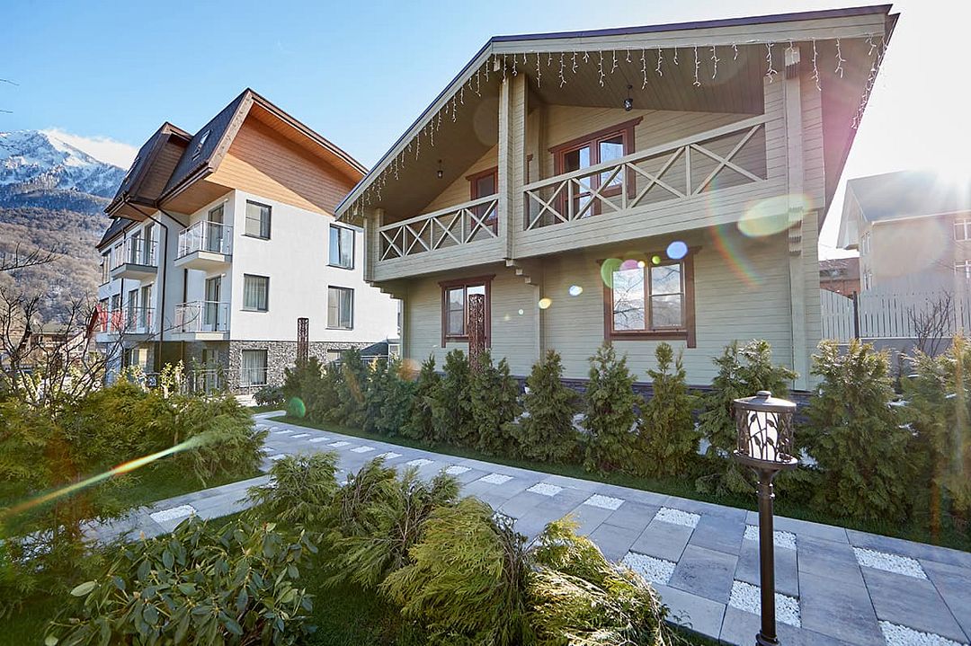 Уютные двухэтажные эко-дома с уникальным дизайном для самых взыскательных гостей. Экстерьер выполнен в стиле шале. Мебель и предметы интерьера выполнены из эко-материалов, а все ткани натуральные и приятные на ощупь. На первом этаже расположена большая превосходно оформленная гостиная зона (с оборудованной кухней, телевизором и большим столом из натурального дерева) и спальня с двуспальной кроватью. На втором этаже находятся четыре спальни. В двух спальнях имеется балкон с видом на горы. Шале имеет две ванные комнаты с душевой кабиной, косметическими принадлежностями (шампунь, кондиционер, гель для душа, мыло, косметический набор). Из окон и балкона резиденции открывается вид на природу Кавказского заповедника. Это настоящее искушение для любителей первоклассного отдыха в горах!Услуги и удобства