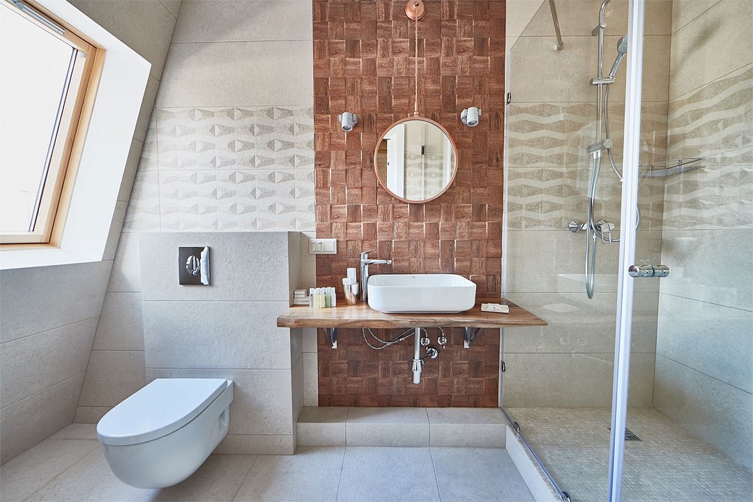Просторный номер в мансарде повышенной комфортности с двуспальной кроватью King size и диваном - кроватью. Ванная комната оснащена душевой кабиной. Для удобства в ванной комнате имеется фен и косметические принадлежности: шампунь, кондиционер, гель для душа, мыло, косметический набор. Для Вашего комфорта в номере есть махровый халат и мягкие тапочки. В номере есть чайная станция и кофе-машина с кофейными капсулами от Julius Meinl, мини-бар с алкогольными и безалкогольными напитками, корзина искушений с выбором снеков премиального качества, бесплатный Wi-Fi и кондиционер. Для гостей, выбирающих номера повышенной комфортности посещение SPA-центра (сауна, хамам, соляная пещера, зал релаксации) предоставляется комплиментарно в утренние и дневные часы (сеансы: 10:00, 12:00, 14:00, 16:00).Услуги и удобства