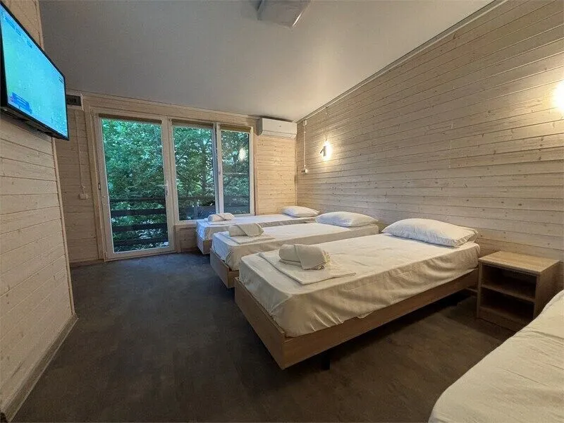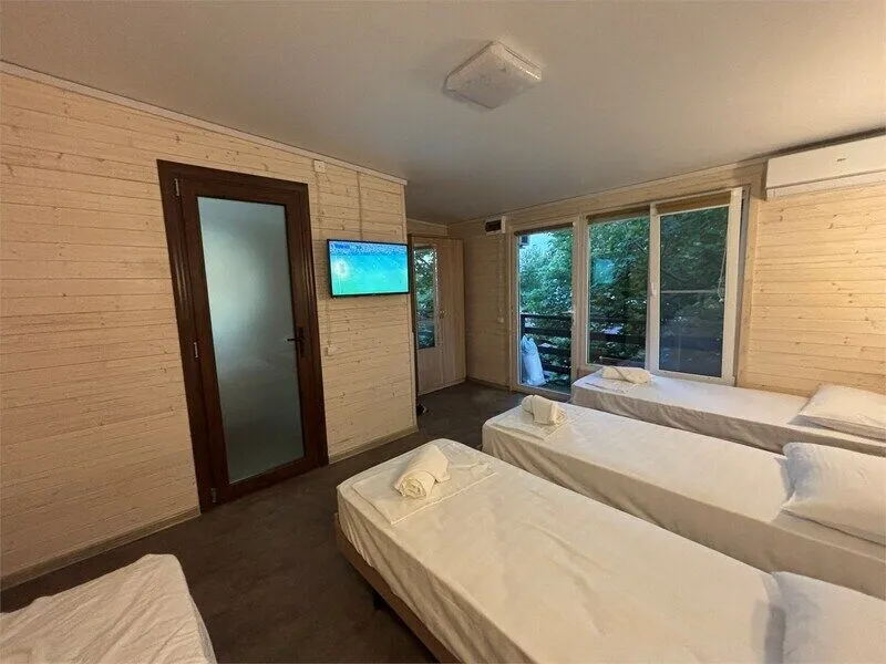 Уютное размещение в деревянном коттедже отеля. Номер располагает отдельным балконом, позволяющим насладиться живописными видами. В вашем распоряжении — просторная ванная комната с туалетом, а также четыре односпальные кровати, создавая оптимальные условия для релакса после насыщенного дня.
