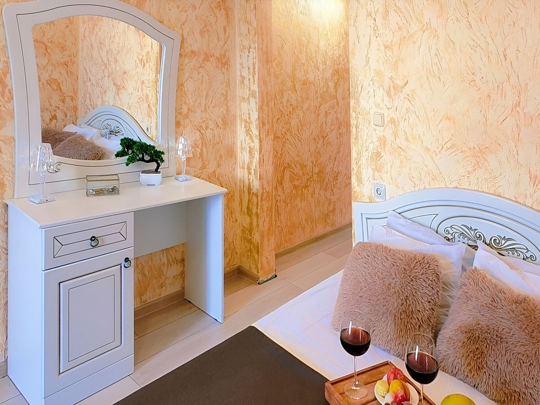 Двуспальная кровать, диван-кровать (120*190), прикроватная тумбочка, шкаф, зеркало, туалетный столик, телевизор, холодильник, кондиционер, электрочайник. Ванная комната: душ, раковина, унитаз, зеркало, фен, косметические принадлежности.