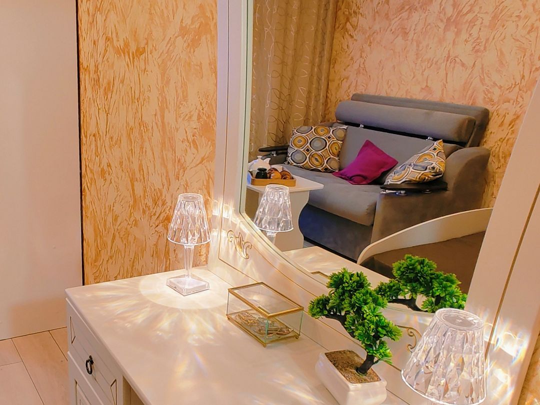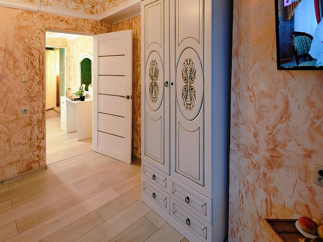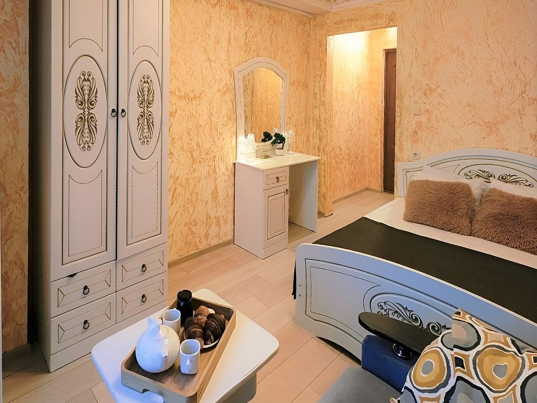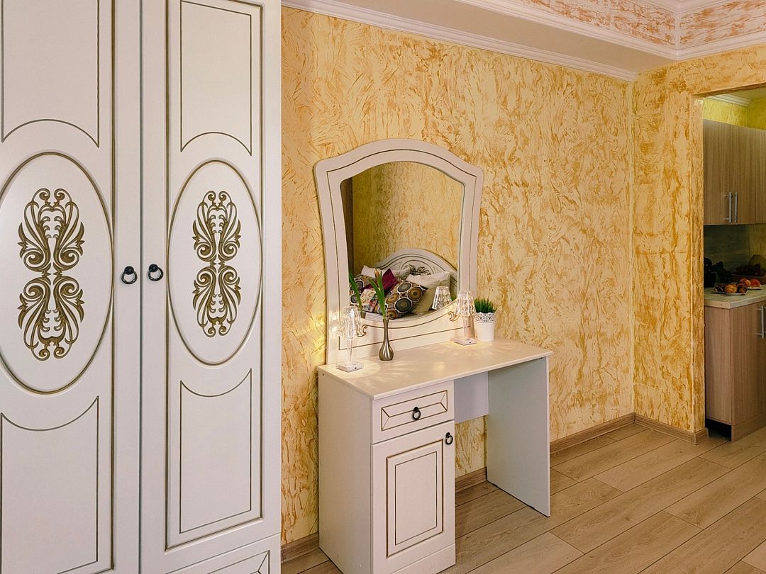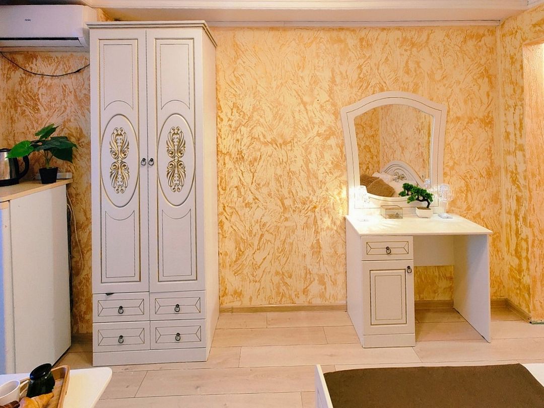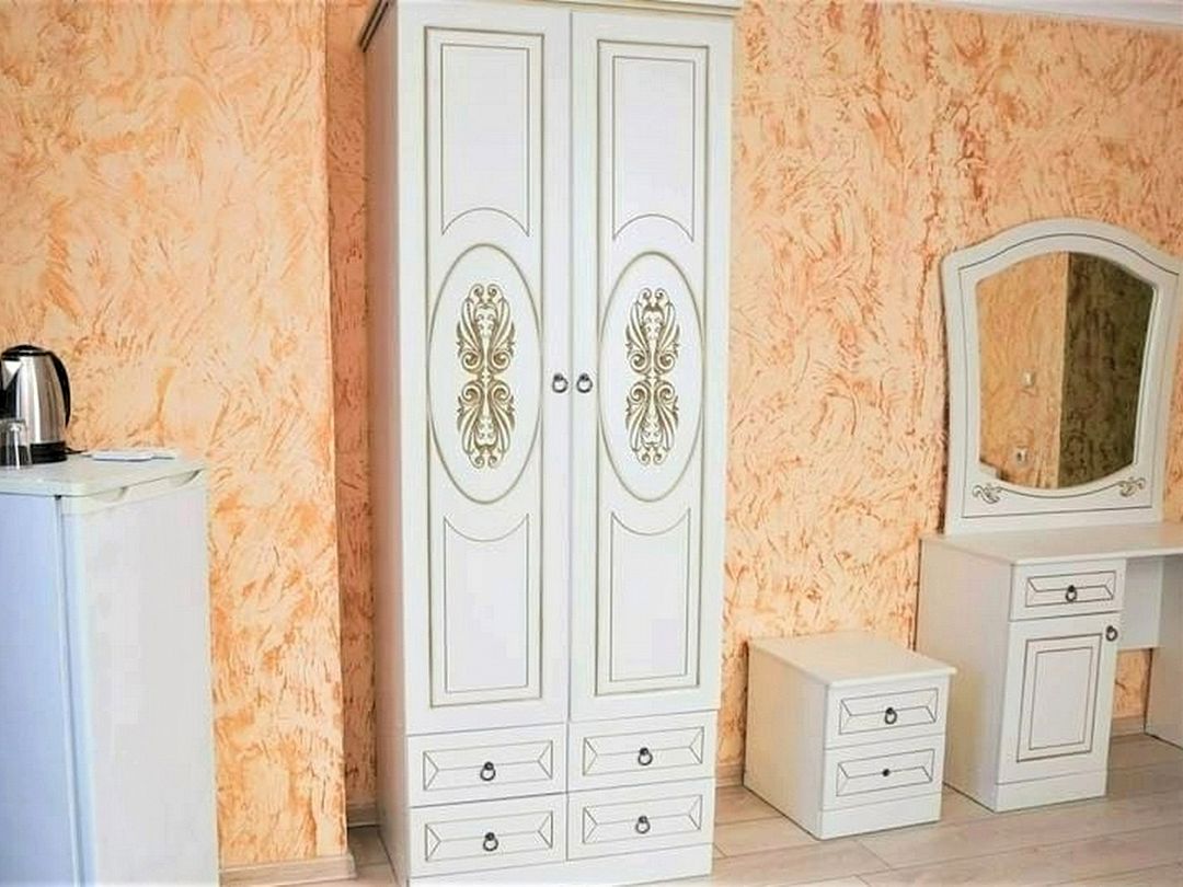 Двуспальная кровать, диван-кровать (120*190), прикроватная тумбочка, шкаф, зеркало, туалетный столик, телевизор, кондиционер, холодильник. Кухонный модуль оснащен электроплиткой, посудой, столовыми приборами, электрочайником. Ванная комната: душ, раковина, унитаз, зеркало, фен, косметические принадлежности.