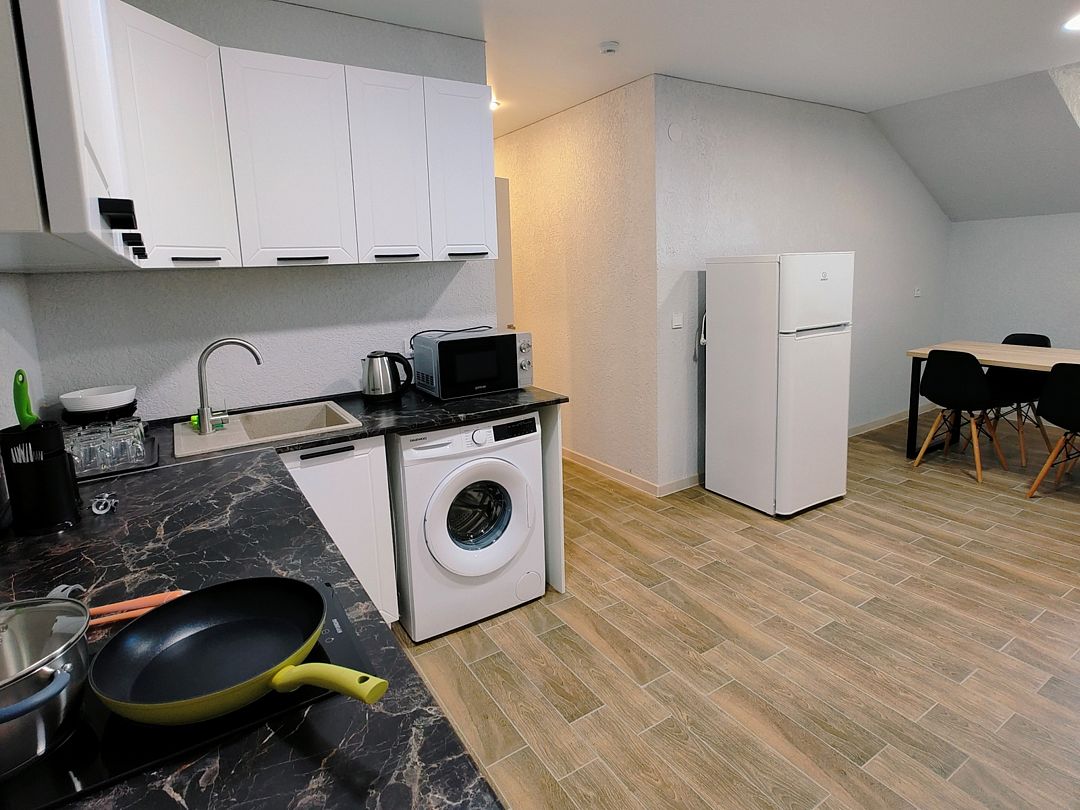 Кухня-гостиная оснащена: кухонный гарнитур, встроенная варочная поверхность, холодильник, обеденный стол, стулья, микроволновая печь, посуда, столовые приборы, кондиционер, электрочайник, стиральная машина-автомат, диванчик.