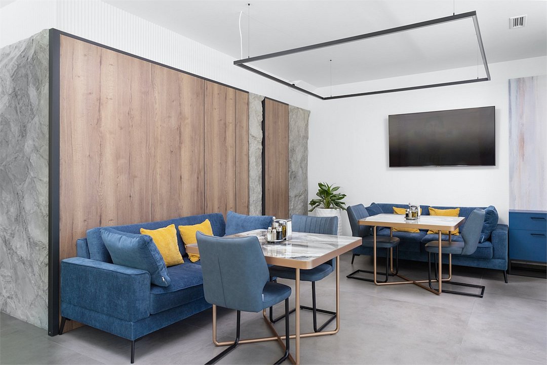 На первом этаже отеля расположено кафе, в котором гостей каждое утро ожидает завтрак с акцентом на «шведский стол», а в остальное время дня — проходит обслуживание по меню.